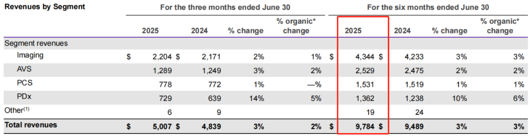 中国市场始终是绕不开的关注焦点。大规模设备更新、集采的余波、招标的陆续推进、高端技术的角力,正共同重塑这个万亿赛道的格局。 巨头们如何应对挑战?中国市场的“冰与火”又藏着哪些信号? 01 业绩分化 增长与承压并存,技术与区域成关键变量 ▐ 西门子医疗:影像支撑增长 西门子医疗最新发布的为2025财年Q3(截至2025年6月30日)业绩。根据计算,其2025上半年集团营收约115.7亿欧元(+7%)。 *** 以下皆统计自2025年1月-6月财报数据 受业绩改善及关税确定性提升利好,西门子医疗上调全年营收指引。 CEO Bernd Montag强调,公司聚焦患者孪生、精准治疗、数字与AI三大技术,并通过200多个“价值合作伙伴关系”将收入转化为经常性收入。财报发布后,其股价在XETRA交易所当日上涨近2%。 影像业务(占比56%):仍是西门子医疗第一大业务。营收65.21亿欧元,同比+10%。