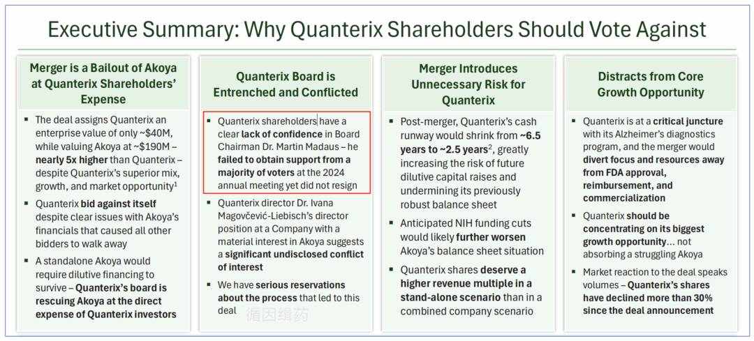 跟大家分享个好玩的。 2025年8月4日,Quanterix,就是单分子免疫技术SIMOA的那个,刚并购完了Akoya的那个...发了个公告。 主要内容就是与Kent Lake和解了,对,就是那个强烈反对Quanterix合并Akoya的那个。(可以翻翻这篇) 2025年1月10日,Quanterix宣布以全股票形式吸收合并Akoya Biosciences。 2025年2月13日,Kent Lake就发布公开信,实名反对Quanterix与Akoya合并。 甚至上线了个网站“Save Quanterix(救救Quanterix)”。 如今,网站已经only fans了... 那么,究竟是什么让他改变主意了呢? 甚至,公告还显示:“根据协议条款,Kent Lake同意撤回其之前为年度会议提交的董事提名和股东提案,并将支持董事会的候选人。此外,Kent Lake同意在Quanterix 2027年度会议提名截止日期前三十天之前遵守惯常的静默期和投票承诺。” 前倨而后恭,思之令人发笑! 呃,你听我狡辩。 第一,合并已经完成,反对已无意义。 虽然Kent Lake作为大股东持股4.4%的Quanterix股票,但是,在目前阶段除了继续恶心Quanterix以外,要拉拢更多的股东付出的代价恐怕比不上收益。 第二,Kent Lake部分目的达成。 Kent Lake当时一个重要的诉求是撤换原Quanterix董事会主席 Martin Madaus。 而2025年7月8日,Martin Madaus已经离任。 第三,Kent Lake还得到了其他好处。 这点我们展开说,这也是我们标题的关键。 “前倨后恭”的秘密 第一,改革Quanterix董事会。 此前,Quanterix董事会分为Class I和Class III两类董事,每个类别的董事任期通常是三年,每年只有部分董事的任期到期并需要重新选举。 这必然造成董事会抱团,客观上限制了股东对董事会的影响。 Quanterix与Kent Lake的协议就包含改革董事会,取消分级制度。 进而,Kent Lake还要提高自己的影响力。 第二,“渗透”Quanterix董事会。 二者达成的另外一个点就是Kent Lake得以通过提名董事候选人,进而达到影响Quanterix董事会决策。 具体的是由一家从Kent Lake选定的高管猎头公司提供6名候选人名单,Quanterix和Kent Lake将共同从名单中选出一名候选人,并在2025年12月1日之前任命其为Class I董事。 “候选人都是我提供的,你怎么跟我斗?” 第三,报销,统统报销! Quanterix将报销Kent Lake自2025年1月10日以来与公司合作、谈判和签署协议相关的合理费用,最高不超过95万美元。 “你笑我前倨后恭,我笑你钱包空空” 最后 本来是个好玩的故事,不过... 悲哀的发现,似乎就我们是白跟着起哄了... 注1:https://ir.quanterix.com/news-releases/news-release-details/quanterix-announces-cooperation-agreement-kent-lake-capital 注2:https://ir.quanterix.com/static-files/b0d5b0d8-6c31-4c79-b86b-222d86c226ea |