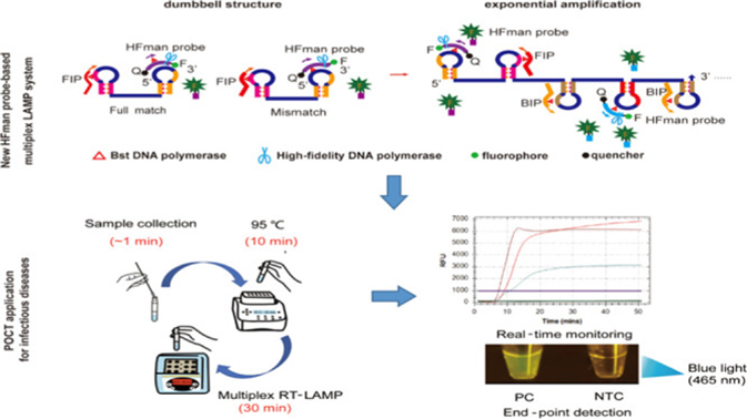 三、为什么是技术革命? ✅精准性跃升:假阳性率显著降低(探针只结合目标序列) 案例:HFman探针法检测新冠病毒 ·灵敏度:3拷贝/反应 ·临床样本检测一致性达99% ·结果时间:4~45分钟 四、未来展望 家庭化检测:便携设备+冻干试剂盒,实现居家自测; 结语 LAMP探针法正推动分子诊断进入“精准+即时”时代!从基层诊所到边境检疫,从食品安全到疫情监控,这项技术将让病原体无所遁形,为公共健康筑起智能防线。 .本文参考Zhang X. et al. Diagnostics (2023) 。数据及图片均来源于原始文献。 |