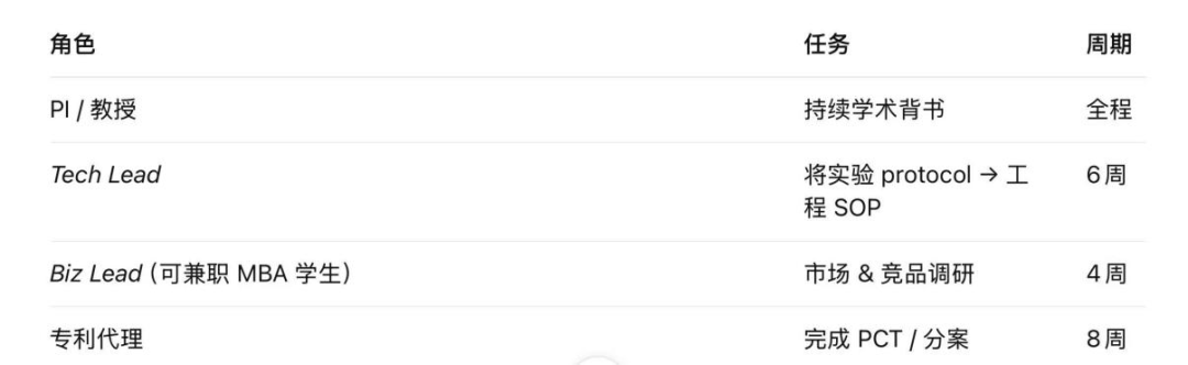 商业化速度的关键变量,不是技术,而是“决策半径”。成功项目中,几乎都在第 2–3 个月就完成了一个“轻量团队”的搭建 —— 一般为 3–5 人核心小组,涵盖技术/学术负责人、产品转化负责人、早期市场调研助手、专利代理,甚至部分实验员会兼职早期运营。