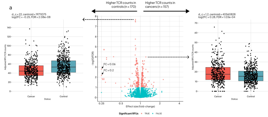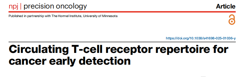 近日,杂志npj precision oncology上发表了一篇题为“Circulating T-cell receptor repertoire for cancer early detection”的文章,本研究聚焦于利用循环TCR repertoire功能单元(RFU)分析提升液体活检的敏感性。通过从血液buffy coat中提取gDNA并测序TCR β链,构建基于序列相似性的RFU,识别肿瘤相关免疫特征。研究团队假设,TCR RFU可作为互补性生物标志物,与ctDNA和蛋白质标志物整合,使早期肺癌的敏感性增高了20%。这一策略不仅利用了现有液体活检的残留样本(无需额外采样),还可能拓展至其他免疫原性癌症的早期筛查。 图片来源:npj precision oncology TCR repertoire功能单元(RFU)的 定义及工作流程 T细胞通过T细胞受体(TCR)识别肿瘤抗原的特性,可产生独立于ctDNA的生物标志物。T细胞增殖可能放大微小肿瘤的免疫信号,而循环TCR repertoire分析可通过高通量测序捕获这些肿瘤特异性免疫信号。 作者研究了463名肺癌患者(86%为I期)和587名非癌症患者,使用血液buffy coat 对TCR β链进行测序,每个样本中位数为113,571个TCR克隆型,在癌症患者和非癌症对照组之间TCR克隆型数量类似。经过筛选的 TCR 根据序列相似性作为距离指标被聚类到TCR repertoire功能单元(RFUs)中,定义为可能识别相同/相关抗原的TCR群。对 RFU 应用广义线性回归模型,识别出那些与癌症状况单独相关联的 RFU。与癌症显著相关的 RFU 被联合起来用于训练一个机器学习模型,以预测癌症状况。 TCR RFU工作流程概述。图片来源:npj precision oncology 肺癌相关RFU的发现 作者接下来利用RFU数据集进行癌症病例/非癌症对照关联测试,以确定癌症相关的RFU。经过数据过滤及将人口统计学和技术协变量(如年龄、性别、种族和TCR库深度)纳入分析, 作者最终共鉴定出327个与癌症状态相关的RFU,其中157个在癌症样本中富集,倍数变化在1.03至2.26之间,170个在非癌症对照中富集,倍数变化在1.05至17.2之间(图a)。 肺癌相关RFU的鉴定。图片来源:npj precision oncology 利用RFU预测癌症 接下来,作者研究了肺癌相关的RFU是否可以作为肺癌早期检测的生物标志物。作者实施了一个机器学习(ML)模型来预测癌症相关RFU的癌症状态,并使用10倍交叉验证(CV)对其进行评估。结果显示,测试数据集ROC AUC为0.72,其中0-I期肺癌为0.71,II-IV期肺癌为0.74(图b)。该模型可以以80%的特异性检测到48%的I期受试者(图c),并且该模型可以区分肺癌和良性结节(图d),突出了这种早期检测方法的前景。 利用RFU预测癌症。图片来源:npj precision oncology 结合TCR RFUs的多分析物液体活检预测肺癌 作者训练了TCR RFUs、蛋白质生物标志物和ctDNA突变的个体癌症预测模型,并试图分析TCR成分对早期癌症检测的额外贡献。结果显示,当将TCR RFU生物标志物添加到ctDNA突变和蛋白质模型中时,对I期癌症的敏感性大幅提高,在单一癌症类型筛查试验上观察到高达20%的增加(图d)。相比之下,TCR RFUs在II-IV期癌症的检测中取得了的提高相对有限(图e)。不仅如此,作者还表明TCR信号与ctDNA突变(如TP53、KRAS)无相关性,证实其为独立生物标志物。 结合TCR RFUs的多分析物液体活检预测肺癌。 图片来源:npj precision oncology 总结与讨论 作者尝试通过循环T细胞受体库的测序来利用T细胞对肿瘤的识别来提高液体活检的敏感性。作者研究了463名肺癌患者(86%为I期)和587名非癌症患者,使用从血液中提取的gDNA,进行了TCR β链测序,并依据TCR序列相似性将克隆型聚类到TCR库功能单元(RFUs)中。作者确定了327个与癌症相关的TCR RFUs,RFU癌症评分检测到近50%的I期肺癌,特异性为80%;并使多分析物癌症筛查试验的敏感性提高了20%。总的来说,结果表明循环TCR RFU分析通过肿瘤特异性免疫信号提升早期肺癌检测敏感性,可以补充已建立的分析,多组分整合模型(TCR+ctDNA+蛋白质)可显著改善早期癌症筛查效能。该研究为早期癌症无创检测提供了新范式,凸显免疫应答信号在液体活检中的不可替代价值。 |