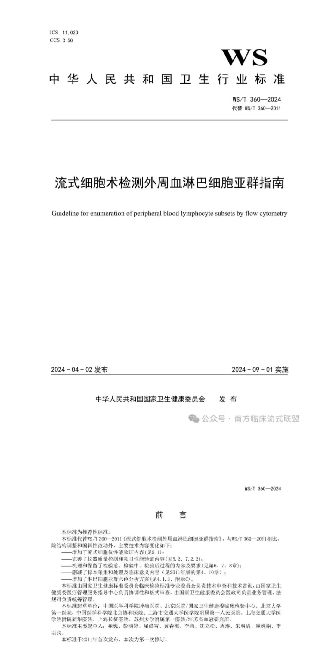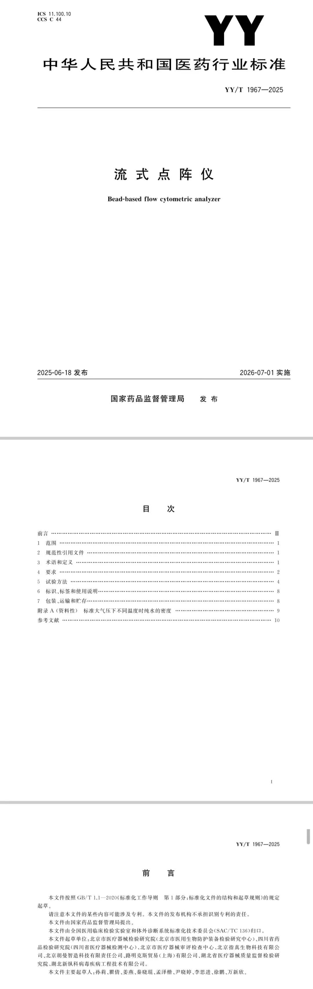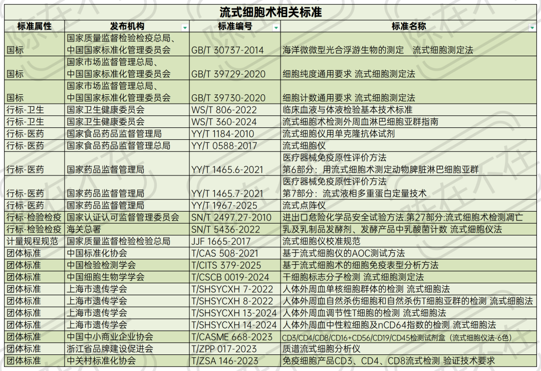 计量技术规范《流式细胞仪校准规范》 (JJF 1665-2017): 从分辨力,线性相关系数,检出限,漂移,重复性,示值误差等方面,对基于荧光检测原理的分析型流式细胞仪的校准进行了规范。 细胞流式仪器方面,还有浙江省品牌建设促进会的团标《质谱流式细胞分析仪》(T/ZP 017-2023)。 行标《流式细胞仪用单克隆抗体试剂》 (YY/T 1184-2010): 本标准规定了流式细胞仪用单克隆抗体试剂质量检验的通用技术要求。包括术语和定义、分类和命名、要求、试验方法、标签和使用说明、包装、运输和贮存。本标准适用于医学实验室使用流式细胞仪对临床标本进行淋巴细胞表型分析、白血病/淋巴瘤分型或其他疾病的诊断和监测等所使用的流式细胞仪用单克隆抗体试剂。 细胞流式应用国标《海洋微微型光合浮游生物的测定流式细胞测定法》(GB/T 30737-2014): 规定了海洋微微型光合浮游生物中原绿球藻、聚球藻和微微型真核藻类细胞数量的流式细胞测定法。 中国标准化协会《基于流式细胞仪的AOC测定方法》(T/CAS 508-2021): 基于流式细胞仪的可同化有机碳(AOC)测试的方法原理、试剂和材料、仪器和设备、采样和保存、试验步骤、记录、精密度和质量保证等内容,适用于饮用水中AOC的测定。 国标《细胞纯度通用要求流式细胞测定法》(GB/T 39729-2020) 国标《细胞计数通用要求流式细胞测定法》(GB/T 39730-2020): 分别规范了流式细胞仪测定细胞纯度、细胞数量的术语、定义和缩略语、方法原理,以及包括试剂或材料、仪器设备、样本制备、试验步骤、数据分析、方法确认和报告的通用要求。 行标《进出口危险化学品安全试验方法第27部分:流式细胞术检测凋亡》(SN/T 2497.27-2010): SN/T 2497的本部分规定了进出口危险化学品安全试验中,流式细胞术检测凋亡的术语和定义、试验方法和结果分析。 行标《乳及乳制品发酵剂、发酵产品中乳酸菌计数流式细胞仪法》(SN/T 5436-2022): 利用流式细胞术对乳及乳制品发酵剂、菌粉、发酵乳、发酵型含乳饮料中的乳酸菌进行计数。 行标《临床血液与体液检验基本技术标准》(WS/T 806-2022): 其中针对淋巴细胞分群,CD34+干细胞计数,HLA-B27检测的抗体选择,样本前处理和储存,检验特殊要求,质控和检测报告等方面进行了规范。 行标《流式细胞术检测外周血淋巴细胞亚群指南》(WS/T 360-2024): 本标准取代WS/T 360-2011。 新增淋巴细胞亚群六色分析方案,强调淋巴细胞亚群的鉴定至少使用联合CD45的四色抗体组合方案。 明确了检验前和检验中样品的详细要求,并强调样品应按照生物安全防护要求进行操作和废弃物处置。 新增自动样品制备:自动加样、加抗体,混匀、裂解、震荡等,实现从血样样本到结果一站式解决方案。 新增外周血淋巴细胞亚群检测系统的性能验证,并细化了外周血淋巴细胞亚群检测项目的精密度、稳定性、线性范围和可比性验证要求。 新增/完善流式细胞仪性能验证和维护保养。 中国检验检测协会《基于流式细胞术的细胞免疫表型测定方法》(T/CITS 379-2025): 本文件规定了基于流式细胞术的细胞免疫表型分析方法的试剂和设备、操作步骤、性能验证和质量控制。 上海市遗传学会系列团标 《人体外周血单核细胞群体的检测流式细胞法》(T/SHSYCXH 7-2022) 《人体外周血自然杀伤细胞和自然杀伤T细胞亚群的检测 流式细胞法》(T/SHSYCXH 8-2022) 《人体外周血调节性T细胞的检测 流式细胞法》(T/SHSYCXH 13-2024) 《人体外周血中性粒细胞及nCD64指数的检测 流式细胞法》(T/SHSYCXH 14-2024) 分别聚焦流式细胞法检测不同细胞亚群比例的检测原理、试剂和耗材、仪器设备、前处理及分析参数设置、分析步骤和方法特性等内容。 中国细胞生物学学会的《干细胞标志分子检测流式细胞测定法》(T/CSCB 0019-2024): 规定了流式细胞术测定干细胞标志分子的方法的一般性要求,适用于体外培养的哺乳动物干细胞的标志分子检测,涵盖表面标志分子和胞内标志分子的测定方法。 行标《医疗器械免疫原性评价方法第6部分:用流式细胞术测定动物脾脏淋巴细胞亚群》(YY/T 1465.6-2021): 本标准规定了用流式细胞术测定动物脾脏淋巴细胞亚群的方法,适用于评价医疗器械/材料诱导产生的免疫应答。 细胞流式应用方面,另外还有: 中国中小商业促进会 《CD3/CD4/CD8/CD16+CD56/CD19/CD45检测试剂盒(流式细胞仪法-6色)》(T/CASME 668-2023) 中关村标准化协会《免疫细胞产品CD3、CD4、CD8流式检测验证技术要求》(T/ZSA 146-2023) 微球流式与应用行标《流式点阵仪》(YY/T 1967-2025): 流式荧光技术是基于编码微球和流式技术的高通量多重检测技术,对同一样品中的多种被分析物同时进行定性和/或定量检测。 流式点阵仪则是基于流式荧光技术的高通量检测设备,通过识别编码微球及其表面所结合目标物质,进行定性和/或定量检测。 除了流式细胞仪的技术要求,本标准强调了分类正确率和分类差错率。 分类正确率是指在指定靶区实现准备分类的微球数占被均一粒径圈门总微球数的比例。 分类差错率是指错误分类到其余靶区微球数占被分类到不同靶区的微球总数的比例。 行标《医疗器械免疫原性评价方法第7部分:流式液相多重蛋白定量技术》(YY/T 1465.7-2021):本标准规定了利用流式液相多重蛋白定量技术定量检测样本中多种可溶性蛋白的试验方法,适用于评价医疗器械/材料诱导机体产生的免疫应答。 在精准