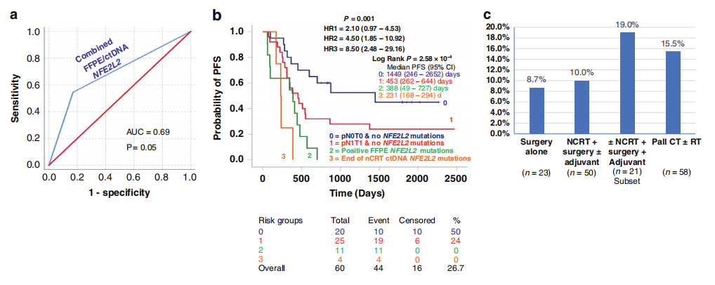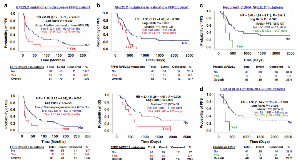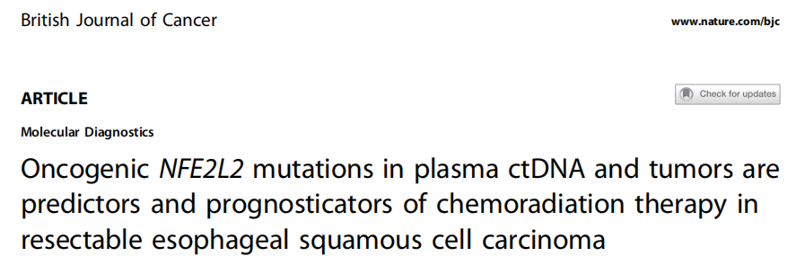 食管癌(EC)在全球死亡率中排名第六,生存率低。食管鳞状细胞癌(ESCC)是东亚地区常见的主要组织学亚型,也是最具侵袭性的胃肠道癌症之一。与单纯手术治疗相比,局部晚期ESCC接受新辅助放化疗(nCRT)后食管切除术的总体生存率更高,但约30%的患者对治疗反应不佳,病理完全缓解(pCR)率仅为31.4%-43.2%。研究指出,当前缺乏有效的早期预测和预后生物标志物,导至无法及时调整治疗方案或避免不必要的治疗毒性。尽管既往基因组学研究报道了 NFE2L2 突变在食管鳞状细胞癌(ESCC)的发展中起作用,但在活检和血浆循环肿瘤 DNA(ctDNA)中其预测和预后价值的直接证据,以及其在nCRT治疗反应中的作用机制仍不明确。 近日,杂志British Journal of Cancer上发表了一篇题为“Oncogenic NFE2L2 mutations in plasma ctDNA and tumors are predictors and prognosticators of chemoradiation therapy in resectable esophageal squamous cell carcinoma”的文章。在本研究中,作者利用两个独立队列中 171 例 ESCC 患者的肿瘤组织和血浆 ctDNA,提供了全面的基因组突变谱证据,证明了在治疗前和手术后跟踪致癌性 NFE2L2 突变(位于 DLG 和 ETEG 基序内)或在治疗期间连续监测ctDNA是有用的nCRT预测因子和局部晚期ESCC生存的独立预测因子。 图片来源:British Journal of Cancer 主要内容 研究方法概述 研究分为发现队列和验证队列两部分。发现队列包括81例接受nCRT治疗的ESCC患者的石蜡包埋(FFPE)肿瘤样本(37例治疗反应良好,44例反应不良)。验证队列包含68例患者的FFPE样本和60例患者的245份连续血浆ctDNA样本,用于验证NFE2L2突变的预测和预后价值。通过靶向测序(TOMA 130基因面板和AVENIO 77基因面板)分析突变谱,并通过数字PCR(dPCR)和Sanger测序验证关键突变。研究还评估了NFE2L2突变与病理反应、无进展生存期(PFS)和总生存期(OS)的关联。 研究方法概述。图片来源:British Journal of Cancer 对良好应答者和不良应答者 中体细胞突变的识别 在性别、年龄、放疗前分期、转移或复发状态方面,良好应答者和不良应答者之间未观察到显著差异。不良应答者在治疗后的病理分期(ypTNM)、non-pCR和OS与良好应答者有着显著差异。 作者分析了良好和不良应答者中SNV(单核苷酸变异)和 CNV(拷贝数变异)的基因差异。结果显示,两组之间未观察到非沉默型 TP53 突变的差异。在五名不良应答者中发现了两种基因的重复错义突变,即 EGFR(R252H)和 TP53(H193L),这些突变显示出促进 nCRT 治疗反应不佳的趋势。CTNNB1 和 EZH2 的重复错义突变仅存在于良好应答者中。这些突变的临床意义尚不明确,但 TP53(H193L)这一变异很可能具有致癌性。 NFE2L2突变的预测与预后价值 研究发现,NFE2L2基因的致癌突变(集中在DLG和ETGE两个KEAP1结合基序)与nCRT治疗反应不良显著相关。在发现队列中,34.1%的疗效不佳患者携带NFE2L2突变,而疗效良好者均未检出(P < 0.0001)。这些突变患者的中位PFS(10个月 vs. 41个月)和OS(11个月 vs. 42个月)显著缩短,复发风险增加(HR=2.10),死亡风险也增加(HR = 2.26)(下图a)。验证队列进一步证实,NFE2L2突变在治疗后肿瘤和转移淋巴结中的检出率分别为35.5%和31.3%,且与更差的PFS(HR = 2.35)和OS(HR = 2.41)独立相关(图 b)。 NFE2L2突变的预测与预后价值。 图片来源:British Journal of Cancer NFE2L2突变可用于 术后监测以更早发现病情进展 通过纵向监测ctDNA,研究发现NFE2L2突变在治疗过程中的动态变化可预测复发风险,治疗结束后检测到NFE2L2突变的患者复发风险增加5.9倍(HR = 5.90),死亡风险增加4.75倍(HR = 4.75)。治疗结束时的ctDNA突变状态是独立的预后因素,其检测比影像学评估提前158天预测复发。同时,NFE2L2突变导至NRF2通路激活,免疫组化证实100%(7/7)ctDNA突变患者存在NRF2过表达,表明NFE2L2突变可作为ESCC疗效预测和复发监测的生物标志物。 结合病理T/N分期和ctDNA突变状态,研究团队构建了风险分层模型:高风险组(NFE2L2突变阳性)的复发风险是低风险组的8.5倍(HR = 8.50)(图 b),提示其作为微小残留病(MRD)标志物的潜力。 NFE2L2突变可用于术后监测以更早发现病情进展。 图片来源:British Journal of Cancer 机制与临床转化意义 NFE2L2 突变中有 75% 集中在 KEAP1 结合的 DLG(D29-L30-G31)和 ETGE(E79-T80-G81-E82)基序内,其余突变则出现在这些区域附近。这种在 KEAP1 结合区域内部或附近出现的致功能性突变的富集,暗示了治疗耐药性的机制基础,因为破坏 NRF2 - KEAP1 结合会稳定 NRF2 并驱动细胞保护、抗氧化和生存途径的持续激活。NFE2L2编码的NRF2蛋白是氧化应激反应的关键转录因子,其突变导至KEAP1-NRF2-CUL3信号轴失调,促进肿瘤耐药和进展。研究揭示了NFE2L2突变通过代谢重编程和抗氧化通路激活介导放化疗抵抗的机制。临床转化方面,NFE2L2突变状态可指导个体化治疗策略,如对突变阳性患者采用更积极的辅助治疗或靶向NRF2通路的药物(如谷氨酰胺酶抑制剂)。研究还提出,ctDNA监测可优化术后随访策略,实现早期干预。 总结与讨论 本研究采用下一代测序技术对关键食管癌驱动基因进行分析,并比较对放化疗反应良好的患者与不良应答患者基因组变化。分析表明,位于 DLG 和 ETGE KEAP1-结合位点上的致癌性 NFE2L2 突变预示着不良的治疗效果,NFE2L2 突变与约两倍更高的复发和死亡风险相关。连续的 ctDNA 分析进一步表明,在新辅助放化疗后检测到的致癌性 NFE2L2 突变是复发(HR = 5.90)和生存(HR = 4.75)的独立预后因素。基于病理 T 和 N 分期、阳性 FFPE(HR = 4.50)以及 ctDNA NFE2L2 突