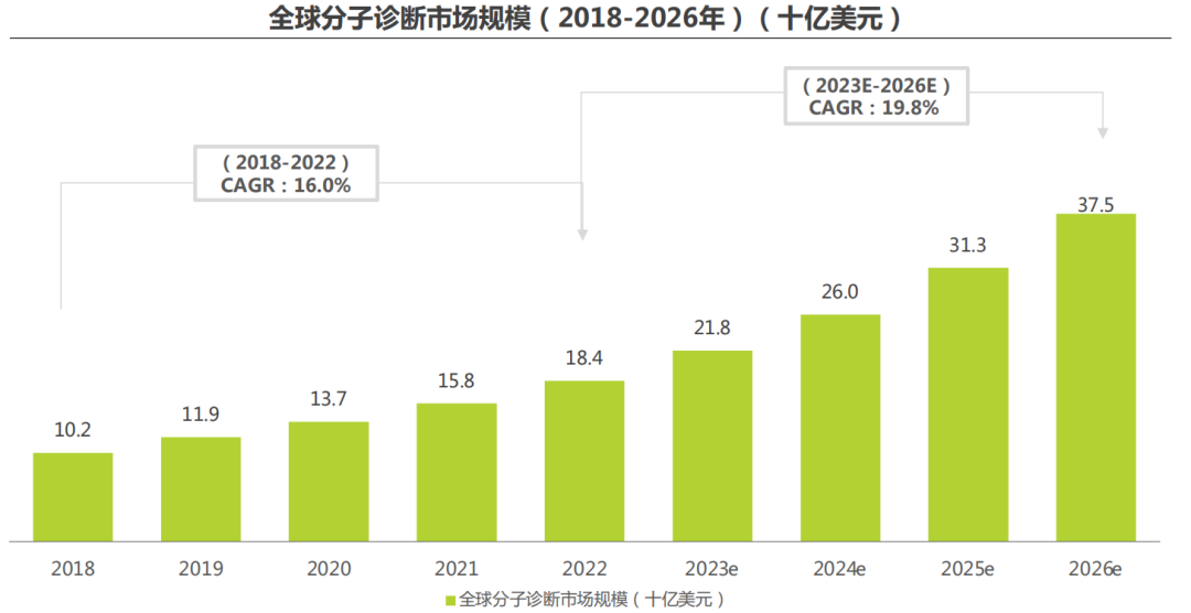 全球分子诊断市场正在经历显著的增长,从2018年的102亿美元增长到了2022年的184亿美元。这一增长主要得益于传染病、癌症、遗传病等领域分子诊断技术的普及以及新技术如三代数字PCR的发展。展望未来,预计该市场将继续保持强劲的增长势头,并在2026年达到约375亿美元的规模。这意味着从2023年至2026年,市场的年复合增长率将达到大约19.8%。 增长驱动因素