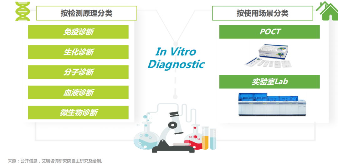 展望未来:IVD潜力无限,推动精准医疗发展随着分子诊断、基因测序、人工智能等前沿技术的不断进步,IVD的应用边界正在持续拓展。个性化医疗、伴随诊断、远程检测等新兴模式正逐步成为现实。未来,IVD不仅将在疾病早期预警、个体化用药、动态健康监测等方面发挥更大作用,也将进一步融入人们的日常生活,成为守护健康的“隐形卫士”。 IVD产品的分类与应用场景:从技术到使用场景的全面解析体外诊断(IVD)产品根据其检测方法或技术,可以分为五大主要类别:免疫诊断、生化诊断、分子诊断、血液诊断和微生物诊断。每种类型的检测原理不同,导至它们在应用现状、适用范围及未来增长点等方面存在显著差异。此外,根据使用场景的不同,IVD产品又可分为POCT(即时检测)和实验室检测两大类。 按检测方法分类