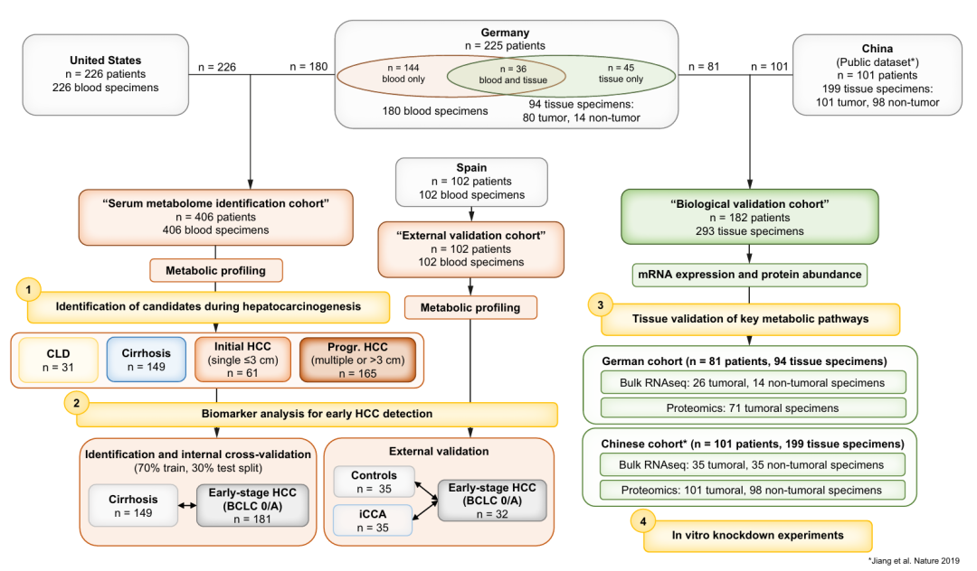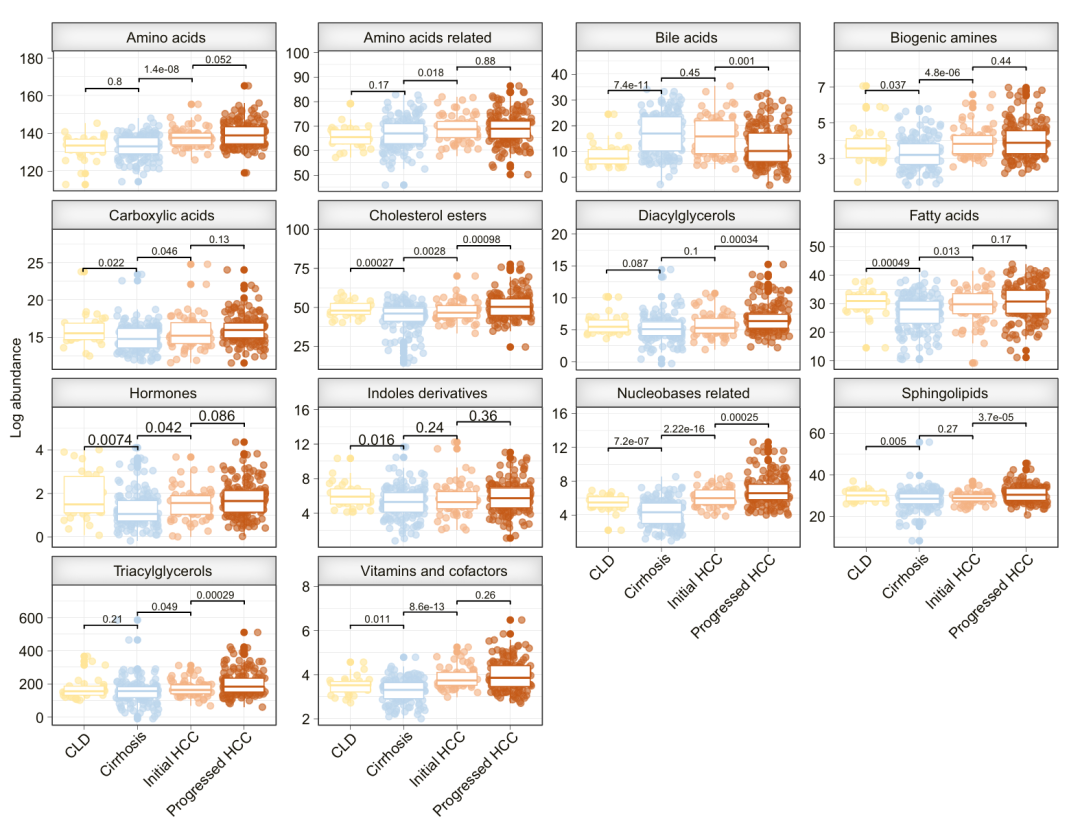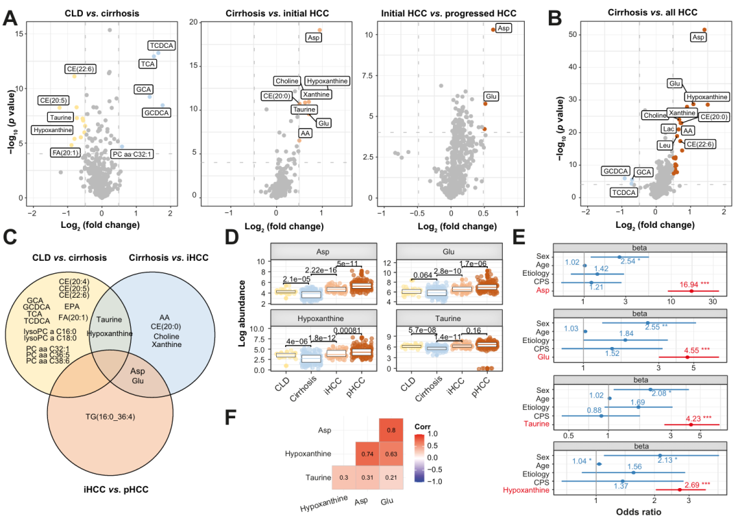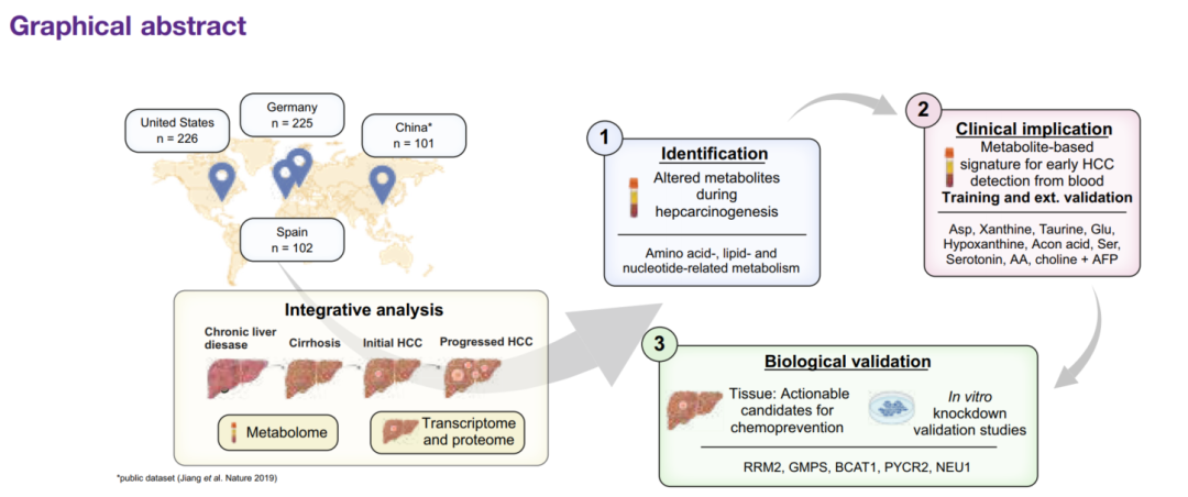 www.lewinbio.com 主要内容 肝癌的死亡率和发病率正持续上升。其最常见的类型是肝细胞癌(HCC),约占 90%,通常发生在患有慢性肝病(CLD)的患者身上,尤其是在肝硬化的情况下。这一逐步发展的过程主要是由慢性炎症引起的。失调的细胞代谢是癌症的一个标志,而肝脏作为人类主要的代谢器官发挥功能。循环代谢物此前已被确定可用于区分肝细胞癌患者和对照组;然而,相关研究队列规模较小,且 / 或仅限于脂肪肝疾病的情况。研究团队提出假设:血清代谢组图谱可直接反映肝癌的发生起始过程,进而为早期诊断提供生物标志物、为化学预防挖掘可干预靶点。 关键结果 1 血清代谢物动态变化:精准标记肝癌发展各阶段 研究将美国与德国的血清样本整合为 “血清代谢组识别队列”(406 例),按疾病进展分为慢性肝病(CLD,31 例)、肝硬化(149 例)、早期肝癌(单个病灶≤3cm,61 例)、进展期肝癌(多发灶或单个病灶>3cm,165 例)四组。 通过对 623 种代谢物的分析,发现: 关键代谢物异常:天冬氨酸(Asp)、谷氨酸(Glu)、牛磺酸(Taurine)、次黄嘌呤(Hypoxanthine)在四组中呈现显著差异,且不受性别、年龄、肝病病因(如酒精性、病毒性、NASH)影响。例如,天冬氨酸和谷氨酸在 “肝硬化 - 早期肝癌”“早期肝癌 - 进展期肝癌” 两个关键节点持续升高,次黄嘌呤和牛磺酸则在 “慢性肝病 - 肝硬化”“肝硬化 - 早期肝癌” 阶段明显变化。 2 代谢组聚类验证:通过无监督双聚类算法 (MoSBi),成功识别出两类特征人群 —— 进展期肝癌人群和无癌肝硬化人群,且花生四烯酸(AA)、天冬氨酸、胆碱、谷氨酸、乳酸是区分两类人群的核心代谢标志物,进一步验证了代谢物变化的临床意义。 3 10 代谢物联合模型:早期肝癌检测 AUC 达 94% 基于上述发现,研究开展了 II 期生物标志物病例对照研究,以肝硬化患者为对照(149 例)、早期肝癌患者(BCLC 0/A 期,181 例)为病例,构建并验证了血清代谢物检测模型: 模型性能卓越:筛选出 10 种核心代谢物(天冬氨酸、黄嘌呤、牛磺酸、谷氨酸、乌头酸、血清素、丝氨酸、次黄嘌呤、花生四烯酸、胆碱),联合 AFP 构建随机森林模型,在内部交叉验证中(1000 次随机拆分训练集 70%、测试集 30%),AUC 达 94%,灵敏度 86%、特异性 84%,显著优于单独使用 AFP(AUC 77.2%)。 外部验证可靠:在西班牙外部验证队列(102 例)中,因检测平台限制仅纳入 5 种核心代谢物(天冬氨酸、谷氨酸、牛磺酸、丝氨酸、花生四烯酸),联合 AFP 后仍实现 AUC 87%(灵敏度 79%、特异性 82%);更值得关注的是,该模型还能有效区分肝癌与肝内胆管癌(iCCA),AUC 达 88%,为肝脏恶性肿瘤的鉴别诊断提供新工具。 4 候选通路的生物学验证:锁定肝癌化学预防新方向 为进一步挖掘代谢异常背后的分子机制,研究通过 “血清代谢组 - 组织转录组 - 蛋白质组” 多组学整合分析,结合体外功能验证,发现: 核心通路紊乱:肝癌组织中氨基酸合成、脂质代谢(甘油磷脂、醚脂质、脂肪酸代谢)、核苷酸代谢通路显著异常,与血清代谢组发现高度一致。例如,多不饱和甘油三酯(如 TG (52:6)、TG (55:6))在肝癌中显著升高,提示脂肪酸重塑在肝癌发生中的重要作用。 可干预靶点明确:在两个独立队列(德国内部队列、中国公开队列)中,RRM2(核糖核苷酸还原酶调节亚基 M2)、GMPS(鸟苷酸合成酶)、BCAT1(支链氨基酸转氨酶 1)、PYCR2(吡咯啉 - 5 - 羧酸还原酶 2)、NEU1(神经氨酸酶 1)5 个基因在肝癌组织中均呈现 “转录组 - 蛋白质组” 双水平上调。 功能验证有效:以 PYCR2 为例,体外 sh-RNA 敲低实验显示,抑制 PYCR2 表达可使肝癌细胞增殖能力下降 32%(72 小时)、集落形成能力下降 77%、迁移能力下降 46%(均 P<0.01),证实其在肝癌细胞恶性表型中的关键作用,为化学预防药物研发提供了明确靶点。 以上研究结果表明,血清代谢组学分析可揭示肝细胞癌发生发展过程中代谢物及代谢通路的异常变化。作者提出的液体活检方法能精准检测早期肝细胞癌,其效能优于目前推荐的监测手段,同时也为筛选肝癌化学预防的可干预靶点提供了助力。 探秘微观,引领生命科技前沿!精准偶联,开启分子操作新时代;超敏检测,赋能临床检验新应用!杭州乐为生医科技有限公司,精心打造多款科研利器: