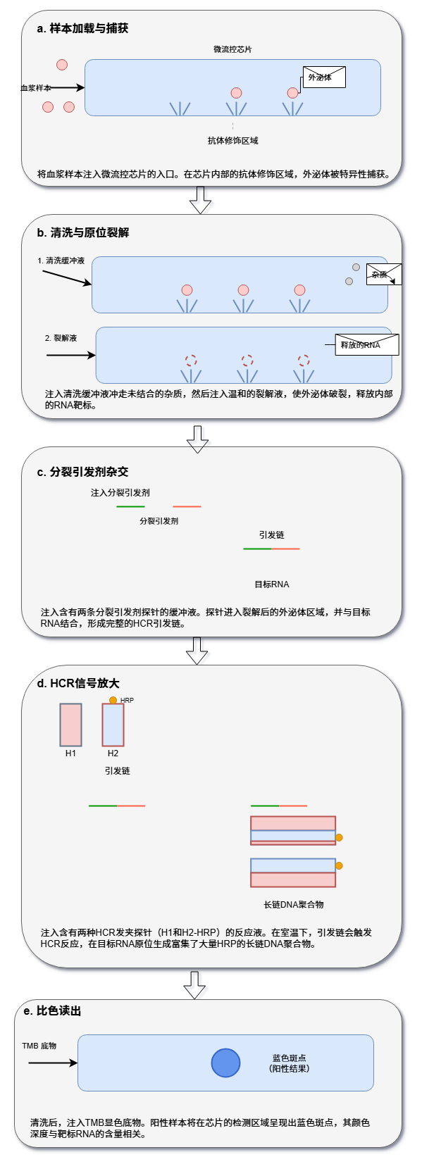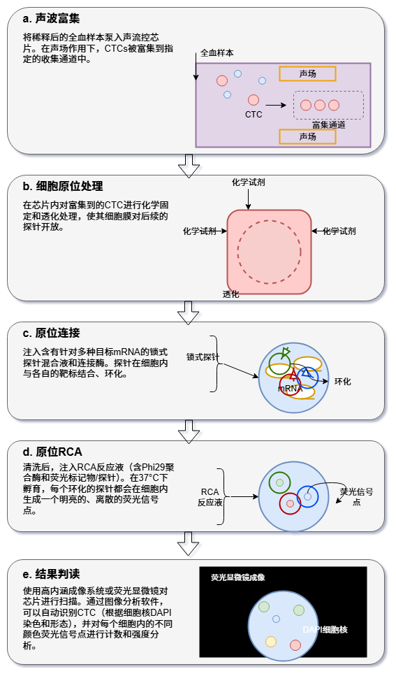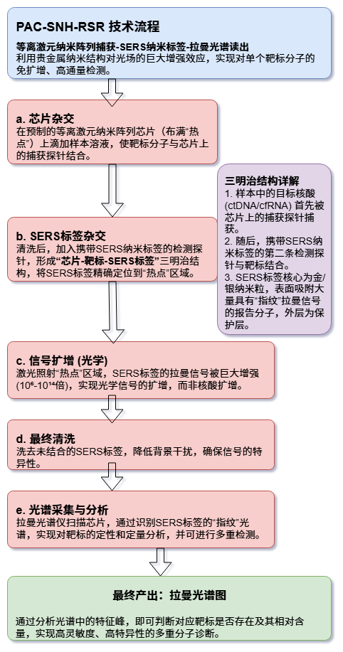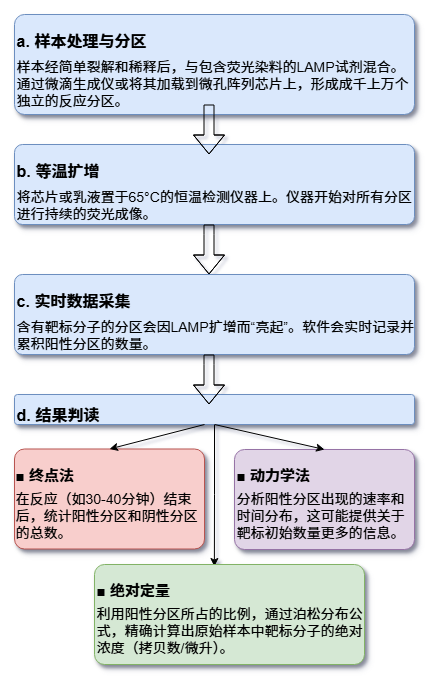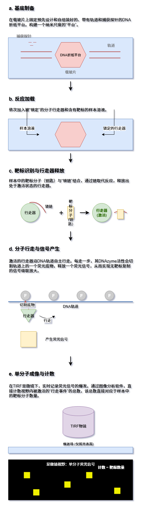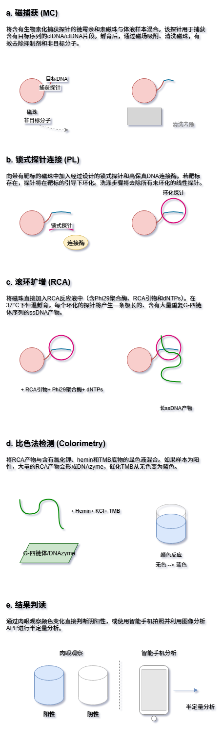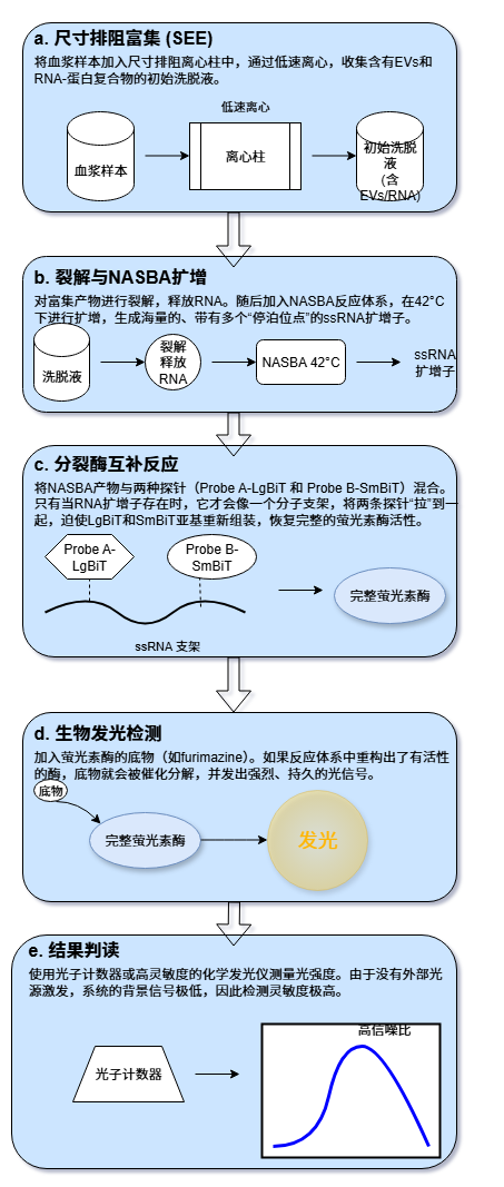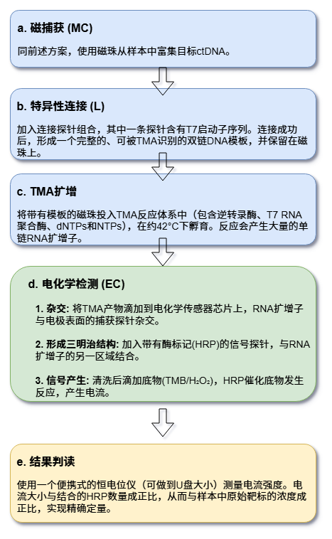 从解码完整的基因组到实时监测血液中的微量肿瘤DNA,创新分子诊断技术正在以前所未有的力量推动医学的边界。这些技术的终极目标,就是在疾病的极早期,甚至在临床症状出现之前,就精确捕捉到源自身体的微弱“求救信号”。 传统的检测方法往往受限于灵敏度、特异性或操作的复杂性,难以满足这一需求。然而,随着生物技术、纳米科学、微流控学和信息科学的深度融合,新一代的分子诊断策略应运而生,它们如同身怀绝技的“分子侦探”,通过精巧的靶标捕获、创新的信号放大和高灵敏度的信号读出机制,将检测的极限不断推向新的高度。 一. 磁捕获-锁式探针连接-滚环扩增-DNAzyme比色法 (MC-PL-RCA-Color) 这项技术整合了高效的磁珠富集、高特异性的探针连接和强大的等温扩增能力,最终通过肉眼可见的颜色变化实现简单快速的即时检测(POCT),尤其适用于资源有限的环境。 以上方法解决了单个靶标的有无判断问题,但在肿瘤等复杂疾病的诊断中,医生往往需要同时监测多个基因位点的突变信息才能做出全面评估。为了满足这一“多重检测”的需求,研究者们在连接步骤引入了“分子条码”的概念,并结合了强大的测序技术。 二. 磁捕获-条码化连接-LAMP扩增-纳米孔测序 (MC-BL-LAMP-NPS) 该策略的核心在于为不同的靶标“贴上”独特的条码,从而实现高通量的并行检测,特别适合需要一次性分析多个基因突变的复杂场景。 测序提供了丰富的信息,但其设备和数据分析仍有一定门槛。为了追求更极致的便携化和定量能力,另一条技术路径是将分子信号转化为易于测量的电信号,从而催生出小型化、甚至手持式的检测设备。 三. 磁捕获-连接-转录介导扩增-电化学传感 (MC-L-TMA-EC) 此方法将高效的RNA扩增技术与高灵敏的电化学传感相结合,旨在打造出能够实现现场精确定量的便携式检测系统。 除了光学和电学信号,分子的另一个基本物理属性——质量,同样可以作为检测的依据。质谱技术以其极高的分辨率和准确性,为核酸检测提供了一种无需标记、直接“称量”扩增产物的独特视角。 四. 磁捕获-连接-RPA扩增-质谱分析 (MC-L-RPA-MS) 该技术结合了快速的RPA扩增和精准的质谱读出,通过精确测量扩增产物的分子量来确认靶标的存在,特异性极高。 前面的技术主要聚焦于游离的核酸(cfDNA/ctDNA)。然而,疾病的信使并非只有裸露的核酸,它们还常常被包裹在细胞外囊泡(如外泌体)或整个循环肿瘤细胞(CTC)中。捕获这些“包裹”并分析其内部信息,开辟了新的诊断维度。以下技术将目光从“分子”转向“颗粒”乃至“细胞”级别的目标。 五. 微流控免疫捕获-原位裂解-杂交链式反应-芯片比色法 (μFICL-SI-HCR-Color) 此方案利用微流控芯片实现了“捕获-裂解-检测”流程的自动化整合,直接在芯片上对外泌体内的RNA进行原位分析,灵敏且高效。 六. 声波富集CTC-原位连接滚环扩增-多色荧光成像 (ACE-IS-L-RCA-MFI) 这项技术更进一步,直接在捕获到的单个循环肿瘤细胞(CTC)内部对多种mRNA进行可视化定量,为理解肿瘤异质性提供了强大的细胞级分辨率工具。 无论是经典的靶标扩增,还是原位的信号放大,其核心都在于生成更多的信号分子。受自然界中蛋白质相互作用的启发,科学家们设计出一种全新的信号产生机制. 利用靶标分子作为“分子胶水”,将原本无活性的分裂酶片段重新组装起来,从而“无中生有”地创造出酶活性。 七. 尺寸排阻富集-NASBA扩增-分裂萤光素酶报告系统 (SEE-NASBA-SLCR) 该方法将高效的NASBA扩增与极其灵敏的生物发光系统相结合,其读出背景信号极低,实现了惊人的检测下限。 当灵敏度推向极致时,我们不再满足于测量一个体系的总体信号强度,而是渴望直接“数出”样本中究竟有多少个目标分子。这种从模拟信号到数字信号的转变,即“数字化检测”,是实现绝对定量的终极方案。 八. 直接裂解与分区-数字化LAMP-实时荧光计数 (DLP-dLAMP-RFC) 该技术通过将样本分割成数以万计的独立微反应单元,实现了对单个核酸分子的“是/非”判断,最终通过统计阳性单元的数量来完成绝对定量。 数字化检测通过“分区”实现了单分子计数,但它依然依赖于对靶标的扩增。那么,是否存在一种方法,能够在不复制任何核酸分子的情况下,直接观察和计数单个靶标分子呢?答案是肯定的。这需要我们将目光投向纳米尺度的分子机器和先进的光学成像技术。 九. DNA折纸基底捕获-分子行走器-单分子荧光成像 (DOC-TMW-SMI) 这是一种革命性的免扩增、单分子检测策略。它在纳米平台上,将靶标识别事件转化为一个持续运动的“分子行走器”,通过记录其产生的信号轨迹来实现单分子计数。 十. 等离激元纳米阵列捕获-SERS纳米标签-拉曼光谱读出 (PAC-SNH-RSR) 此方法同样是免扩增的,它利用贵金属纳米结构对光场的巨大增强效应,实现对单个靶标分子的免扩增、高通量检测。 结语 从基于酶促扩增的等温方法,到结合便携测序和电化学传感的集成系统;从分析游离核酸,到原位探测外泌体与循环肿瘤细胞;再到无需扩增、直击单分子的数字与纳米技术,我们看到了一幅波澜壮阔的分子诊断技术创新图景。这些技术路径尽管各异,却共同指向了未来医学的核心趋势. 更高灵敏度以实现极早期诊断,更高通量以绘制疾病全貌,更快速度与更低成本以走向即时检测,以及更深层次的自动化与智能化以赋能精准
