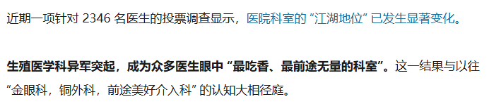 随着全球经济寒冬的发生,这两年,医生的日子变得越来越难过。降薪、欠薪、停薪甚至因为医院倒闭,导至医生失业的情况也屡见不鲜。医疗行业“寒冬”降临的消息不绝于耳。诊疗量和手术量“双降”已成为许多医院面临的残酷现实。 有医院走廊空荡,候诊区只有零星几个人,专家号当天就能挂到。然而,在这片寒冬景象中,当一些曾经的明星科室为发不出绩效而苦恼时,另一些以往不起眼的科室却悄然崛起,成为医院收入的中流砥柱。根据国家统计局发布的《中国统计年鉴2024》,2023年,我国总人口为14.097亿,其中65岁以上老人占比15.4%,共有2.17亿人。虽然根据联合国标准,15.4%的老年人口占比已经到达了中度老龄化的标准,但总抚养比仅为46.5%,属于一个相当健康的比例。此外,我国的老年人口占比跟日本、意大利那些真正老龄化问题特别严重,老年人口超25%甚至逼近30%的国家相比,不管是比例数值还是比例增长速度,都不算严重。然而,在我国14亿人的人口基数下,老年人口占比问题不算严重,不等于实际的老年人口存在的健康问题就小了。毕竟65岁以上老人有足足2.17亿人。而人类,随着年龄的增长,器官功能会衰退、细胞修复能力会减弱,同时基础疾病会累计变多,对病原体和外界刺激的抵抗力也会降低。年龄越大越难出现完全健康的人,即便是自然衰老也可能给某些个体带来疾病。在如此庞大的老年人口下,老年病科、门诊慢性病等相关科室的就诊需求是不可能随着经济环境的变化而出现下降,而只会是稳定的逐年增加。基于这不可避免的人口趋势与社会现实,我们正在大力发展老年医学。2025年4月28日,国家卫健委发布了《国家卫生健康委办公厅关于印发老年医学科建设与管理指南(2025年版)的通知》。国家卫健委在通知中表示:按照党中央、国务院决策部署,为指导规范老年医学科建设与管理,推动完善老年人健康支撑体系,提升老年医学医疗服务能力,满足老年人医疗服务需求,我委于2019年制定印发《老年医学科建设与管理指南(试行)》。在总结老年医学科建设管理经验基础上,我们修订形成《老年医学科建设与管理指南(2025年版)》。此外,去年,2024年10月,国家卫生健康委下发了《关于提升老年医学医疗服务能力的通知》,提出“到2027年末,力争二级以上综合医院规范设置老年医学科的比例达到80%。”据媒体报道,截至2024年3月,全国设有老年医学科的二级及以上综合性医院占比超过 62%,提前完成到2025年60%的目标。此外,国家卫健委还明文规定,要为老年医学科医护人员提供必需的工作、学习条件,关心关爱医护人员,合理确定老年医学科医护人员薪酬水平,充分调动医护人员积极性,形成稳定的老年医学科医护团队。最近10年,随着短视频、直播与互联网经济的爆火,在网上“出镜”成为了很多人的赚钱渠道。的确,有非常多的手艺人靠着自己精湛的作品出圈,赶上了这一波互联网的浪潮。但也有相当一部分人由于种种原因,无法产出令自己满意的劳动作品,于是选择了露面,想看看自己的样貌能不能有路人缘,从而抓住互联网带来的机遇。因而,在现在这个互联网时代下,有面对公众这一需求的人越来越多,皮肤科和整形外科也越来越受到他们的重视。毕竟,即便不打算整容的公众人物也难免对皮肤管理有着一定的需求。皮肤科自费项目多,门诊为主。多数医院没有住院,甚至部分医院的皮肤科没有夜班,工作强度相对不大。而整形外科虽然要手术,但国内正规医院的整形外科在美容需求上进行的手术大多患者自费、难度不大,相对的手术风险也不大,且术前医患双方有充足的时间进行沟通,医患纠纷风险相对较小。至于需要整形外科进行的正畸类手术因为是患者刚需,它并不会因为美容患者人数的增多而出现下降,因而不论是皮肤科亦或者是整形外科,在这个人们寻求多元化发展的时代,只会发展得越来越好。虽然最近这些年的大趋势是年轻人越来越不愿意生了,妇科、产科、儿科越来越难做了,但令很多人没想到的是,生殖医学相关科室在这股“拒生潮”中异军突起了。在近期一项调查中,生殖医学科被评为医生心中“最吃香、最前途无量的科室”。 这一结果相当出人意料,毕竟在过去很多年中,“金眼科,铜外科,前途美好介入科”才是医生们的共识。当然生殖医学能看似逆时代潮流,甚至在与其他类型科室的pk中拔得头筹,原因是多方面的。首先是其业务范围广泛,治疗费用普遍较高且大多不在医保报销范畴,强大的创收能力为科室发展提供了坚实的经济基础。其次,一个反直觉的事情是,在不想生的大环境下,会求助于生殖医学的患者人数不降反增。的确,目前新生儿相对于夫妻的比例是越来越小了。但这个比例的下降并非是全都不生了,很多人的选择是延后生育时间,不少人甚至是延后10年乃至20年。延后生育时间的结果自然是生育能力的下降。原本在生育能力巅峰时期,无需生殖医学辅助就能拥有孩子。延后数年导至生育能力自然衰退,此时再想繁衍自然必须借助生殖医学的力量。前往生殖医学科进行问诊的人自然也就多了起来。当然,有鉴于生殖医学的费用问题,会主动前往该科室就诊的患者,多为高收入高学历的不孕不育人群。这一类患者沟通相对容易、医患纷争风险值低,门诊环境舒适安静,且通常无病房和急诊任务。医生工作压力小,加班和值夜班频率低