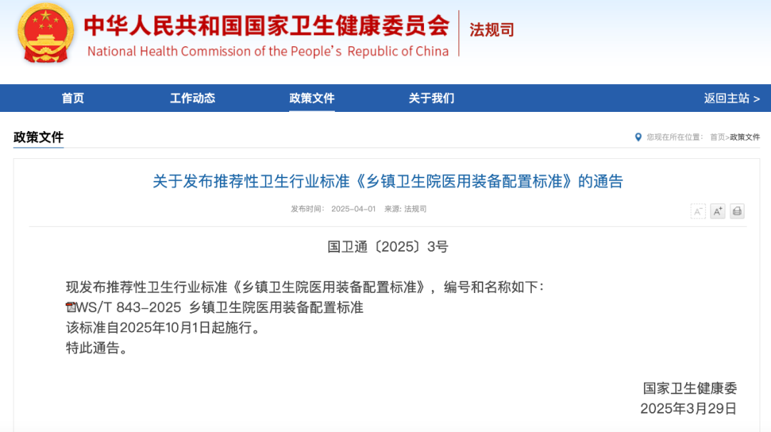 标准规定了乡镇卫生院医用装备(不含中医药服务装备)配置的基本原则、分类品目及数量。适用于所有乡镇卫生院配置医用装备,街道卫生院配置医用装备可参照执行。该《标准》自2025年10月1日起施行。