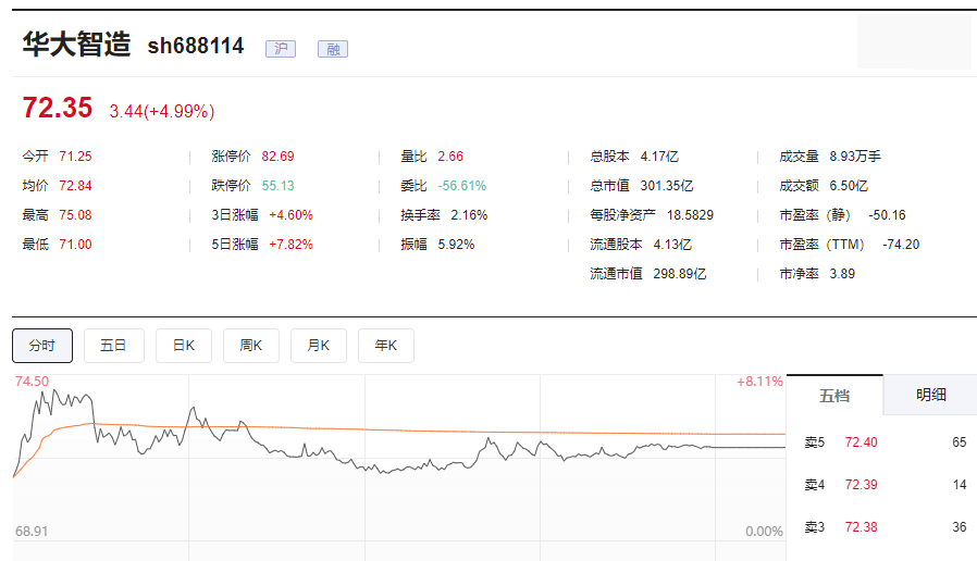 此外,该交易也给二级市场带来了积极影响。10月13日,华大智造股价呈现出上涨态势,表现活跃:当日以71.25元开盘,盘中股价一度冲高至75.08元,相较于前一交易日68.91元的收盘价盘中最高涨幅约达8.95%。当天华大智造最终以72.35元收盘,涨幅4.99%,公司总市值约301.35亿元