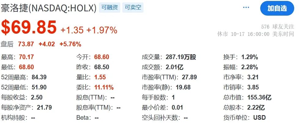 在彭博报道谈判消息后,Hologic股价在盘后交易中上涨约6%,周五纽约收盘上涨2%至69.85美元,对应市值超155亿美元。