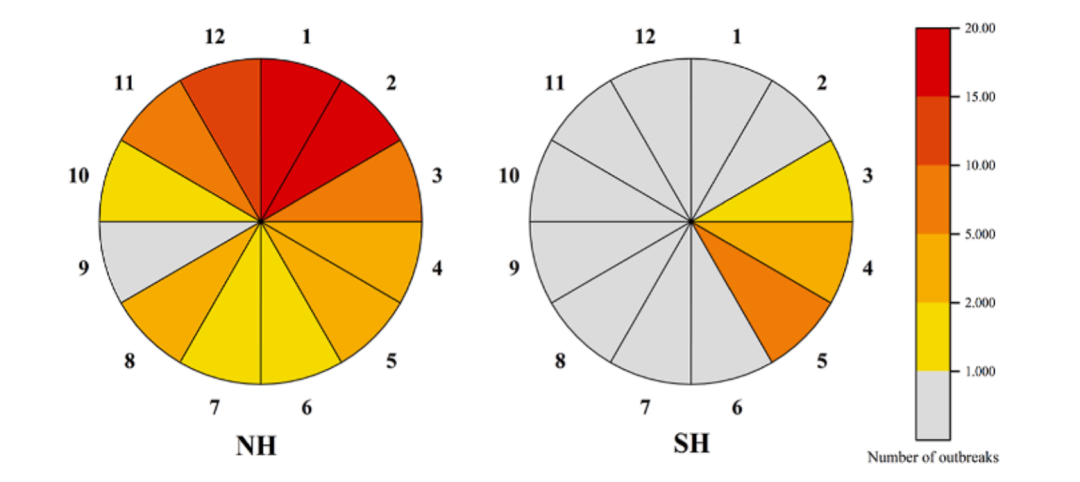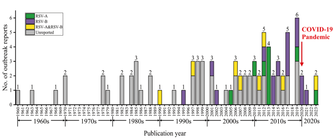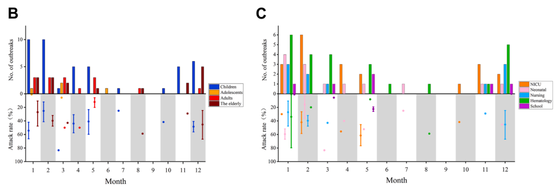 | 呼吸道合胞病毒(RSV)作为急性下呼吸道感染的重要病原,可累及全年龄段人群,对全球公共卫生构成沉重负担。近期《柳叶刀》子刊《EClinicalMedicine》发表覆盖六大洲、跨度逾60年的RSV流行病学荟萃分析,对比不同地区、亚群、季节、年龄及RSV基因型的疫情趋势,为全球RSV疫情的流行病学与临床研究提供重要参考。 主要研究结果速览 PART 01 01 全球RSV疫情整体特征 ●RSV疫情增加: 研究共纳入72篇文献的82起RSV疫情暴发事件,累计2282例病例。随时间推移,RSV疫情暴发总体走高,尤其是近二十年间增加显著,2019年达峰值(6 起)。 图1.1960-2025年全球报告的RSV疫情暴发的时间模式 ●RSV疫情发生区域: 全球有25国报告RSV疫情,以美国(23例)、英国(12例)、中国(9例)次数最多;其余国家分别为巴西、德国、日本、土耳其、保加利亚、法国、韩国、澳大利亚、葡萄牙、科威特、印度等。按WHO区域划分,欧洲和美洲区域发生率最高(36.59%)。 图2. 全球RSV疫情相关研究的地理分布 注释:A.地理分布 C.WHO区域占比 ●患者年龄分布: RSV疫情主要集中在儿童群体,占比52.44%,其次为老年人(20.73%), 成年人(18.29%)和青少年群体(6.10%)。所有年龄段中,2岁组的暴发次数最少,仅2.44%。 ●季节分布: 64.63%的RSV疫情发生在冬季, 其次是春季(17.07%)、 秋季(13.41%)和夏季(4.88%)。具体而言,北半球RSV疫情主要集中在12月至次年2月,而南半球则多发于3月至5月。 图3. 全球RSV疫情相关研究的地月度分布情况 ●高发场所: 血液科/肿瘤中心暴发25起,数量最高,占比30.49%,其次为新生儿重症监护室(24.39%)、新生儿病房及护理机构(15.85%)、养老院(12.20%)、学校(7.32%)、军营(1.22%)及其他场所(包括空军新兵训练营、普通成人病房和普通儿科病房)(8.54%)。 ●RSV基因型差异: RSV-B是最常报告的亚型,占比46.88%,其次为RSV-A(28.13%),混合型RSV-A/B占比25%。 02 RSV疫情的罹患率(attack rate) 在报告罹患率的41起疫情中,其汇总估计值为35.78% (95% CI:29.16–42.67)。儿童相关疫情暴发(42.29%,95%CI:34.53–50.23) 新生儿病房 (44.67%,95%CI:31.76–57.92)和RSV-B基因型研究(46.95%,95%CI:35.20–58.87)比例更高。 图4:不同年龄和环境条件下RSV暴发与月度发病率的变化趋势 注释:B.不同年龄组发病率;C.不同环境条件发病率 03 RSV疫情规模 82起疫情的中位规模13例。RSV-B更易在儿童感染,而RSV-A/B混合感染在老年人中病例更多。青少年和成人疫情较少,但易在人口密集场所如学校和军营爆发大规模疫情。 图5:全球RSV疫情暴发事件数量及病例数按年龄、地区和RSV基因型分类对比 注释:A.不同基因型疫情分布;B.不同地区疫情分布;C.不同年龄疫情规模;D.不同地区疫情规模 04 RSV感染的临床表现 咳嗽最常见(75.69%),其次是发热(53.87%)、流涕(36.89%)和鼻塞 (14.29%)。 ●年龄差异:咳嗽为幼儿和老年人的主要症状,青少年和成人中发热更常见。 幼儿也常见呼吸困难(9.28%); ●基因型差异:RSV-A感染更多表现为咳嗽、 发热和流鼻涕;RSV-B感染则常与鼻塞和喘息相关,发热的患病率明显低。RSV-A/B混合感染症状介于两者之间。 图6:1960至2025年RSV全球疫情按年龄、病毒基因型划分的临床表现与病死率分布 注释:左.按年龄组划分的临床表现;右.按基因型划分的临床表现 05 RSV疫情的病死率(CFR) 绝大多数患者完全康复,仅117例死亡, 合并病例死亡率(CFR)2.77%(95%CI:1.01–5.10)。CFR随时间递减,从1970年前的3.15%降至2020年后的1.24%。 ●年龄差异:老年人死亡人数最多,病死率9.24%(95% CI:2.75–18.07); ●场所差异: 血液科/肿瘤中心病死率最高(7.56%,95% CI:2.56–14.15),其次为养老院和新生儿重症监护室; ●基因型差异: RSV-A/B混合感染病死率最高,达6.31%(95% CI:0.02-18),单独RSV-A亚型次之,单纯RSV-B病毒引发的疫情病死率最低。 图7:1960至2025年RSV全球疫情按年龄、场所及病毒基因型划分的病死率 研究结论 PART 02 自1960年代起,RSV暴发已使全球疾病负担持续攀升,报告事件逐年递增。尽管总体病死率下降,但在老年人、RSV-A/B混合感染及血液肿瘤中心等亚群中仍居高。研究提示应建立更灵敏的监测与快速响应机制,并制定针对高危人群的精准预防策略,方能更好遏制RSV的全球蔓延。 参考文献:Duan Q, Pan J, Zheng L, et al. Global outbreaks of respiratory syncytial virus infections from 1960 to 2025: a systematic review and meta-analysis. EClinicalMedicine. 2025 Jul 10;86:103352. doi: 10.1016/j.eclinm.2025.103352. |
