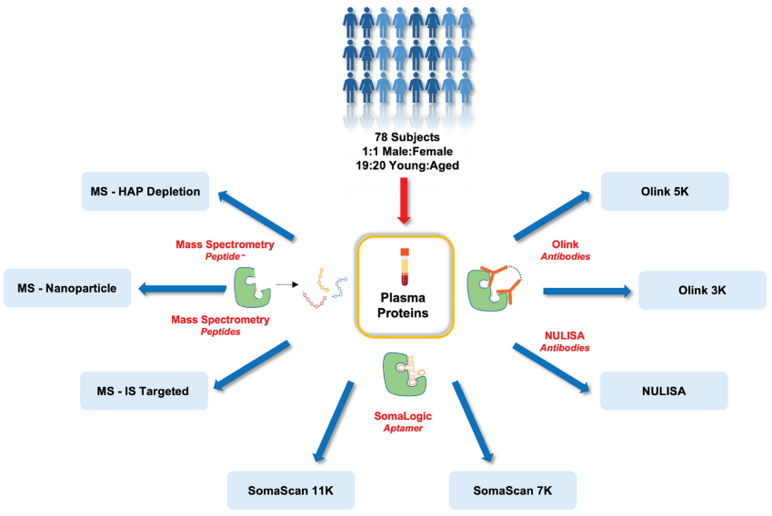 前言 血浆是包括蛋白质在内的生物分子的丰富来源,反映了健康和疾病。由于其在生物过程中的关键作用,蛋白质作为生物标志物具有巨大的潜力,近年来推动了血浆蛋白质组分析的兴起。然而,利用血浆蛋白质组作为生物标志物的来源存在一些挑战。血浆蛋白质组跨越很宽的动态范围,一些生物标志物的浓度很低,使它们的检测和精确定量复杂化。目前,用于分析血浆蛋白质组的两种主要方法是基于亲和力的技术和基于质谱(MS)的方法。然而,对不同血浆蛋白质组学平台性能目前还缺乏系统性比较。 近日,杂志communications chemistry上发表了一篇题为“Current landscape of plasma proteomics from technical innovations to biological insights and biomarker discovery”的文章。本研究通过八种基于亲和力和质谱的技术平台,对同一健康队列进行分析,旨在评估技术差异、互补性及其对生物标志物发现的启示。结果显示,每个蛋白质组学平台都具有独特和互补的优势。应根据研究目标,并权衡覆盖范围、准确性和发现潜力来选择血浆蛋白质组学平台。 图片来源:communications chemistry 主要内容 不同血浆蛋白质组学平台概述 目前,用于分析血浆蛋白质组的两种主要方法是基于亲和力的技术和基于质谱(MS)的方法。基于亲和力的平台,如SomaScan、Olink Explore和NULISA使用结合探针(适体或抗体)来检测蛋白质。质谱方法通常测量蛋白质的蛋白水解肽来获得蛋白质水平的信息。为了应对动态范围的挑战,质谱工作流程可能包括高丰度蛋白质耗尽、肽预分离、蛋白质沉淀、基于离子迁移率的分离、或通过微球或纳米颗粒进行蛋白质富集。 每种方法有其独特的优点和缺点。基于亲和力的技术,比如SomaLogic和Olink利用大型靶向检测面板检测预先选择的蛋白质,可进行高通量测量以及多重检测。然而,特异性取决于许多因素,如结合表位的唯一性、探针的亲和力等。相比之下,基于MS的蛋白质组学可以通过非靶向或靶向方法进行,并且能够识别蛋白质的翻译后修饰(PTMs)和同工型。然而,检测深度有限,难以用于低丰度血浆蛋白。基于纳米颗粒的富集方法,如最近推出的Seer Proteograph™XT,增加可溶性蛋白质组的覆盖率。还有其他富集策略包括perCA耗尽等创新方法可检测低丰度血浆蛋白。 研究队列和蛋白质组学平台概述。图片来源:communications chemistry 技术平台比较 本研究比较了八种蛋白组学技术平台,包括SomaScan 11K/7K、Olink 5K/3K、NULISA、MS-Nanoparticle、MS-HAP Depletion、MS-IS Targeted。结果显示,SomaScan 11K检测到最多蛋白质(9,645种),其次是SomaScan 7K(6,401种)和纳米颗粒质谱(5,943种)。在所有8个平台中,仅有36种蛋白质重叠(下图a)。 精确性角度而言,SomaScan技术变异系数(CV)最低(中位数5.3%-5.8%),Olink 5K/3K CV较高(26.8%,11.4%),但通过信号过滤后可改善。基于MS的平台CV较高, MS-Nanoparticle的中位CV为26.4%,MS-HAP Depletion的中位CV为29.8%,MS-IS Targeted的中位CV为8.3%。 数据完整性角度而言,SomaScan 11K/7K达95%以上,Olink 3K/5K为60.3%和35.9%,质谱平台约53%-60%。 蛋白质定量和检测指标的跨平台比较。图片来源:communications chemistry 技术平台的临床效用评估 作者比较了不同平台对FDA批准的人类血浆217种已知蛋白质生物标志物的覆盖范围。结果显示(如下图),SomaScan 11K覆盖了其中的88%,质谱平台覆盖了73%,Olink 覆盖了57%。MS-IS Targeted的覆盖率较低,为43%。 但需要注意的是,纳米颗粒富集法导至血小板标志物污染指数显著升高,需谨慎解读数据。 技术平台的临床效用评估。图片来源:communications chemistry 平台间重叠蛋白的相关性 作者分析了不同平台上蛋白质强度的相关性(下图b)。结果显示,每个亲和平台的两个版本之间的相关性很高,比如SomaScan 11K和7K 相关性为0.79, Olink 5K和3K 相关性为0.74。在质谱技术中,MS-IS Targeted与其他平台的相关性最强,MS-IS Targeted与Olink 3K的相关性为0.62,是两种技术之间相关性最高的。所有的相关性都表现为双峰模式,这表明存在两组具有明显高相关性和低相关性分布的蛋白质。 不同平台检测出的蛋白质由PANTHER系统分类,结果显示,SomaScan 11k覆盖了最多的蛋白质类别。其中,有数个蛋白类别SomaScan平台唯一表征。与其他平台相比,覆盖最多蛋白质和蛋白质类别的SomaScan 11K也鉴定出最多的生物学相关标记,包括年龄、BMI 和性别。 平台间重叠蛋白的相关性。图片来源:communications chemistry 平台互补性 亲和分析可以有效地检测低丰度蛋白质,适用于大规模标志物筛选,但可能遗漏未知蛋白。而靶向质谱虽然覆盖率较低,但却提供了独特的绝对定量,可用于发现新型标志物(如蛋白质异构体),但需优化低丰度蛋白检测。 技术精度和数据完整性是性能的关键决定因素。SomaScan 7K/11K、Olink 3K、NULISA、MS-IS Targeted等平台具有较低的技术CV,表明生物信号检测能力强。SomaScan 11k实现了最广泛的蛋白质组覆盖和近乎完全的健康血浆蛋白可检测性,使其非常适合于发现研究。然而,亲和分析并不是无偏的,而质谱仍然不能完全实现低丰度蛋白质的稳健定量。非靶向质谱在识别已知面板之外的生物标志物方面表现出色,但纳米颗粒富集等制备方法可能引入血小板等污染物。 结论 本研究为血浆蛋白质组学提供了迄今最全面的技术评估框架,强调不同平台的互补价值。在发现阶段,可优先使用SomaScan或Olink广覆盖平台。在验证阶段,可优先采用靶向质谱(如SureQuant™)确保定量准