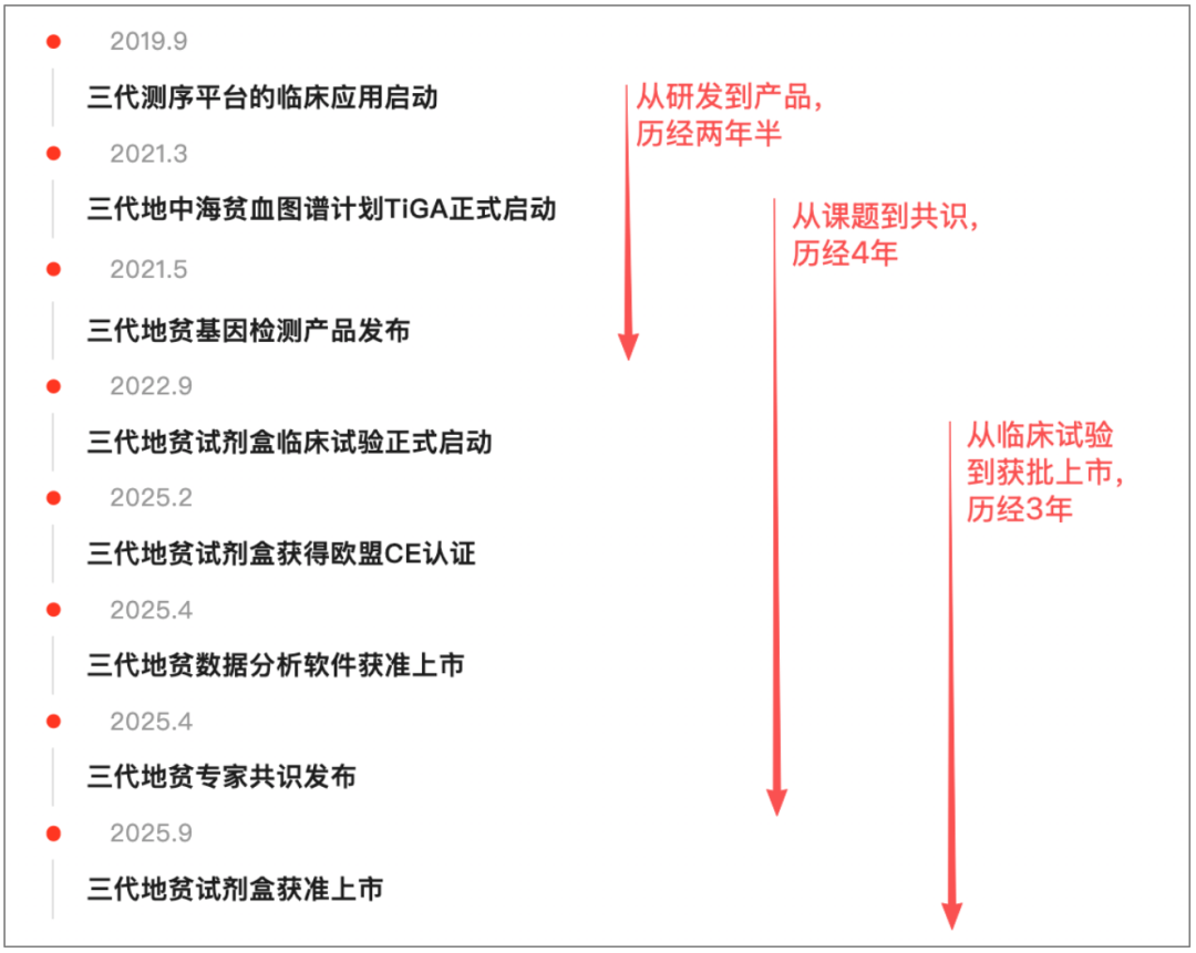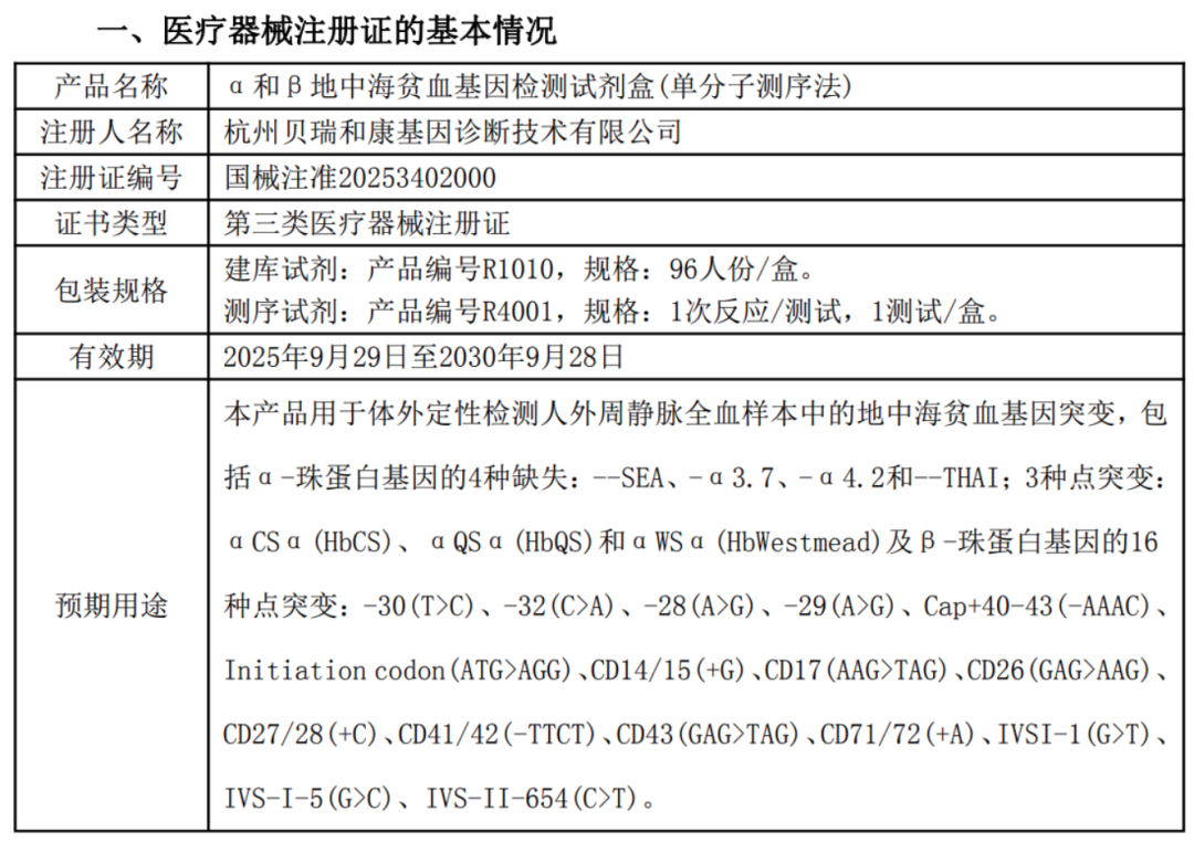 01 死磕三代,终有回响 贝瑞,一直想要复现NIPT曾经的辉煌。 在出生人口断崖下降、检测价格不断走低之后,如何复现? 最简单的方式,以NIPT成功的方式,再造如NIPT的爆品。 这一次,贝瑞把目标锚定在了三代测序。 没有哪一家企业,像贝瑞一样,在三代测序的临床应用上,走得如此坚决。(此处,希望组表示不服。) 以地贫为例,从2019年9月项目立项,到2025年9月产品获批,历经6年。 死磕三代,终有回响。 2025年,贝瑞迎来密集回报期: