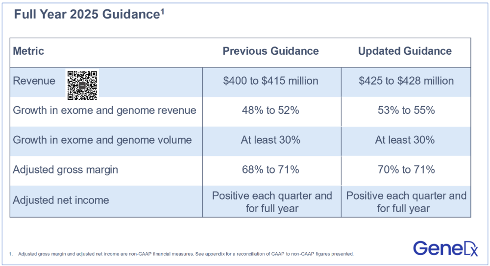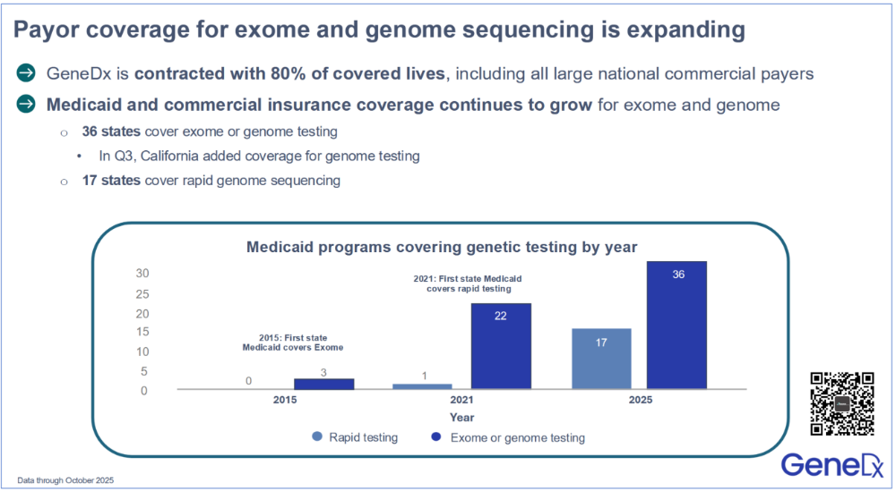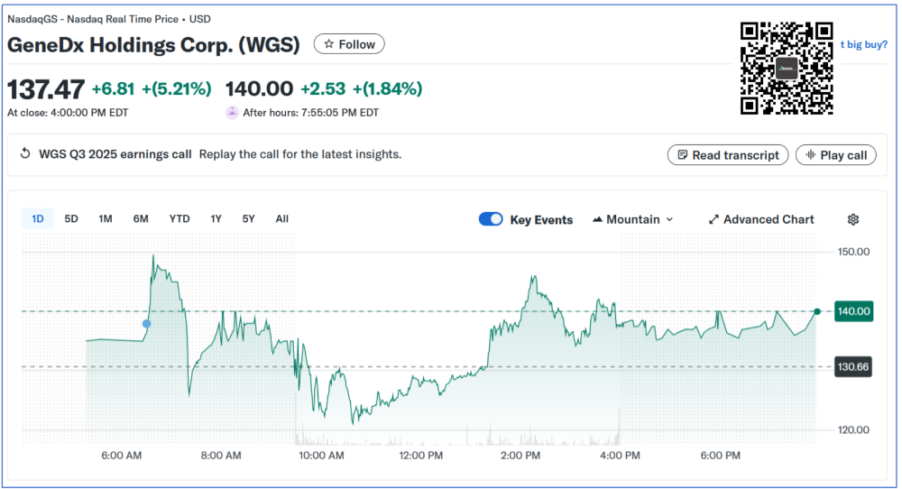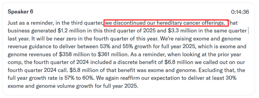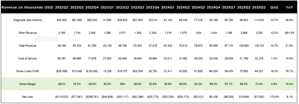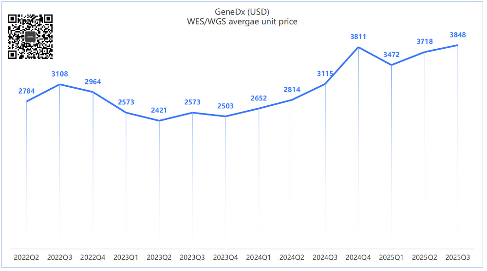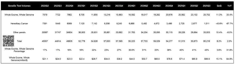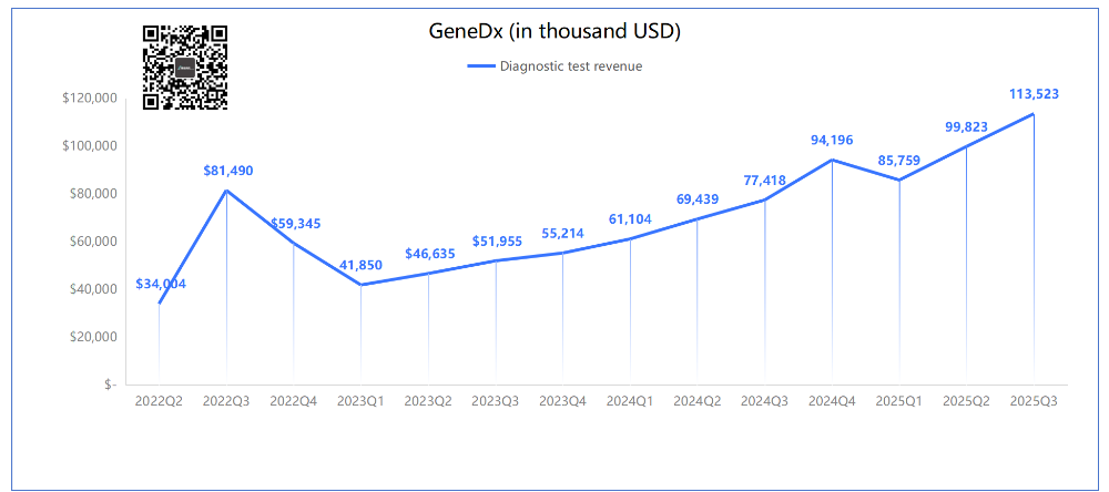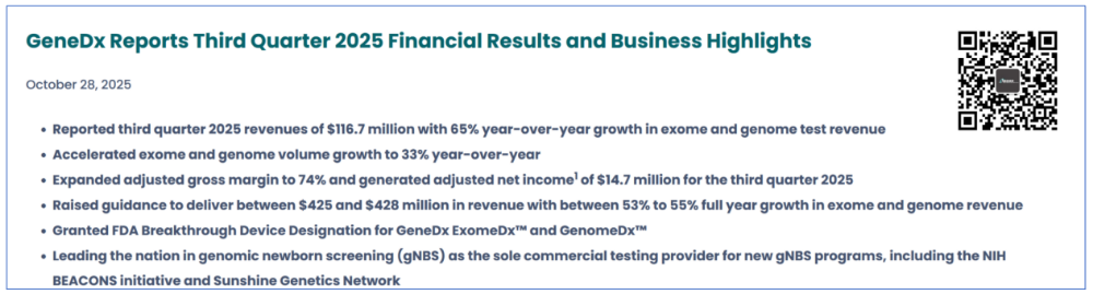 各位亲爱的股东,大家早上好中午好晚上好! 今天聊聊遗传基因检测公司GeneDx。 公司本季度营收1.167亿美元,同比增长51.9%,环比增长13.7%。其中,占主导地位的诊断业务营收1.135亿美元,同比增长46.6%,环比增长13.7%。这还不算啥,更逆天的是其WES(外显子)/WGS(全基因组)检测收入达到9890万美元,同比飙升64.8%,环比增长15.1%。可以这么说,美国新生儿WES/WGS基因检测领域GeneDx就是神!唯一的遗憾是这个季度依旧亏损,不多,也就763.6万美元。你甭管调整后的利润是不是1470万美元,按照GAAP规则下就是亏了,比上个季度差了。另外一个好消息是,GeneDx毛利率达到72.4%,创纪录的新高,为近3年最高。我们看这张表,GeneDx的WES/WGS应收增长明显快于样本量的增长。非常明显,自2023Q2达到2421美元的最低值后,GeneDx的WES/WGS服务单价就一路蹿升。到了2025Q3,这个单价已经是来到3848美元了,突破4000指日可待啊。所以,GeneDx可以狡辩下:我WGS的比例提高了,怎么能说我涨价?这是product mix的变化嘛。本次财报,GeneDx提高了全年的财务指引,将营收从4.00亿~4.15亿美元提高到4.25亿~4.28亿美元。而去年全年营收为3.023亿美元,约增长41%~42%。目前,WES/WGS医保报销的州从2025Q2报道的35个提升到36个。这还没完,GeneDx实际上还有两个可能的业绩催化剂:第一,2025年6月23日美国儿科学会(AAP)发布了更新的指导意见,现在建议在大多数情况下,将外显子组和基因组测序作为儿童全球发育迟缓(GDD)或智力障碍(ID)的首选检测方法。第二,2025年10月20日,GeneDx宣布该公司的ExomeDx全外显子产品和GenomeDx全基因组产品获得FDA突破性医疗器械认定(BDD)。总之,这几个催化剂分别会在短、中期对GeneDx的业绩起到支撑作用。GeneDx趁着这么好的机会,同步挂出了增发的公告。在经历短暂的股价波动下滑后,再次发力,当日上涨5.21%。另外,值得一提的是,在财报电话会议上GeneDx提到在第三季度已经不再继续遗传性癌症检测业务。这块业务占比较小,也更说明GeneDx将继续在新生儿/儿童遗传检测领域聚焦的决心。
