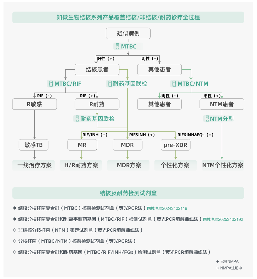 在医保合规的引导以及全国结核鉴定、耐药检测整体降费的趋势下,知微生物本次获证的MTBC/RIF以及已获证的结核分枝杆菌复合群核酸检测试剂盒(荧光PCR法)(国械注准20243402119),将为结核病防控提供更简便、更快速、更精准、更经济、更合规的结核鉴定+分子药敏检测产品。未来,知微生物还将陆续推出多重耐药以及NTM检测产品,丰富并形成覆盖结核病诊疗全流程的产品矩阵,为终止结核病贡献“知微力量”。
