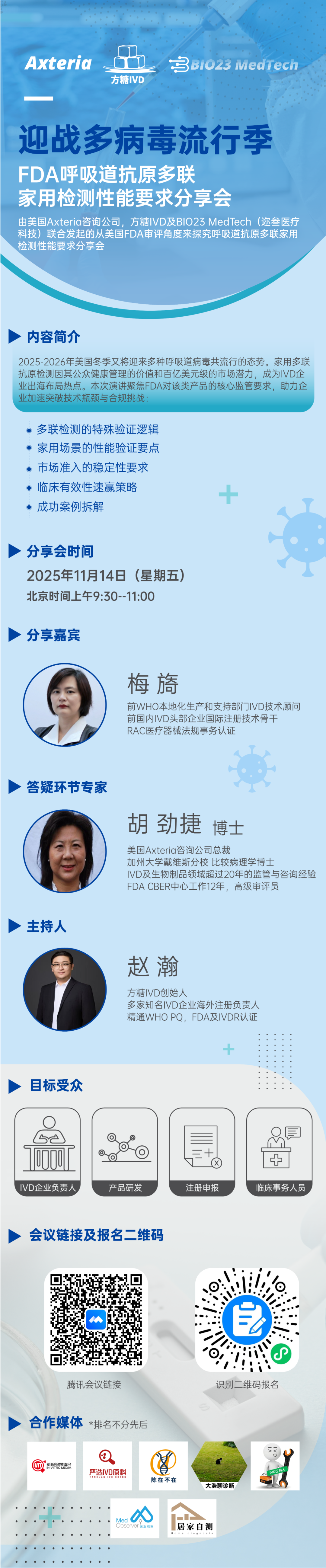 尊敬的行业同仁: 美国2025-2026年冬季预计又将迎来多种呼吸道病毒共流行的严峻态势。随着家用多联抗原检测市场价值凸显,相关产品已成为IVD企业出海布局的热点领域。在此背景下,美国Axteria咨询公司、方糖IVD及BIO23 MedTech(迩叁医疗科技)联合发起本次网络分享会,聚焦FDA对呼吸道抗原多联家用检测的性能要求,助力企业突破技术瓶颈与合规挑战。 会议主题:迎战多病毒流行季:FDA呼吸道抗原多联家用检测性能要求 会议时间:2025年11月14日(星期五)北京时间上午9:30-11:00 会议形式:网络研讨会(腾讯会议+视频号直播) 目标受众:IVD企业负责人、产品研发、注册申报、临床事务人员 本次会议旨在为IVD企业提供最新监管动态和技术指导,助力企业在美国居家检测市场抢占先机。参会者将有机会与行业专家直接交流,获得针对性解答。 请确保您预留时间准时参加,网络会议室人数有限,建议提前进入。后续还计划推出FDA、WHO等系列法规分享会,敬请关注。 让我们共同携手,助力中国IVD企业在全球检测市场取得更大突破! 会议链接 会议报名 |