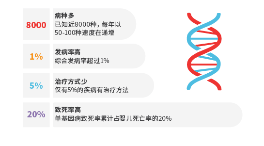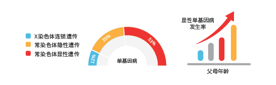有些孕妈妈可能想当然地认为,单基因病是单个基因变异,是不是就比染色体病要轻很多,这可大错特错!单基因病有如下可怕特点: 单基因病是由单一基因的突变导至的疾病,它们可以按照遗传模式分为几类,包括显性遗传、隐性遗传以及性染色体连锁遗传。 隐性单基因病可以通过父母的携带者筛查发现,即如果父母双方都是致病变异的携带者,则他们每次怀孕时,孩子有25%的概率会患上该病,50%的概率成为携带者,25%的概率既不患病也不是携带者。 显性单基因病则不同,只要父母一方携带突变基因就有很大可能性遗传给胎儿。值得注意的是,在显性遗传病中,很多病例可能是由于新发突变引起的,这种情况并不涉及父母的遗传,而是胚胎发育过程中或生殖细胞形成时发生的突变。此外,随着父母年龄的增长,尤其是父亲年龄的增大,某些类型的显性遗传病发病风险可能会增加,这可能与精子中累积的突变有关。 无创单基因病DNA产前检测(NIPT-SGD)通过分析孕妇血液中的胎儿游离DNA,可以准确地检测出胎儿是否有患某些显性单基因病的风险。尤其是父母高龄的情况,更应重视显性单基因病的筛查。 NIPT-SGD可以检测34个基因相关的66种显性单基因病。其中包括: 智力障碍/发育迟缓相关的 20个基因22种疾病 胎儿结构异常及其他相关的 14个基因44种疾病 哪些孕妈妈可以选择? 所有孕周≥12周的单胎妊娠孕妇,在充分遗传咨询的情况下均可自愿选择无创单基因病DNA产前检测(NIPT-SGD)。 以下人群不建议: