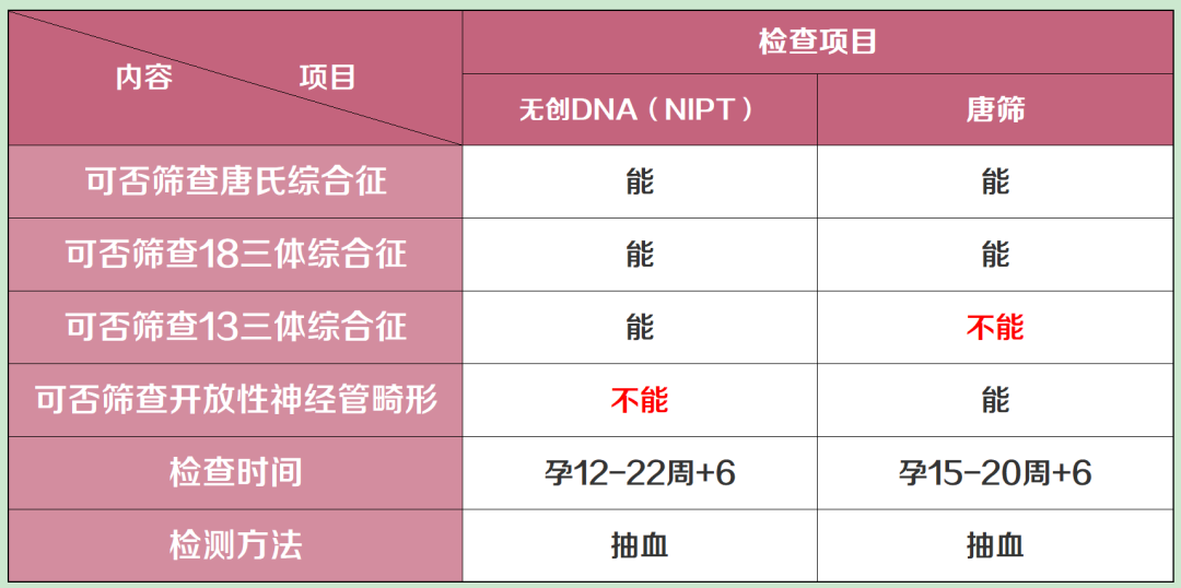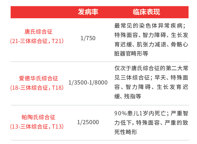 你知道吗?哪怕父母健康,但住在温暖子宫中的胎儿也在面临着很多遗传病的挑战。 染色体是我们遗传信息的主要载体,几乎所有的遗传物质都储存在这里。在每个人的身体细胞中,通常会有23对染色体,总共46条,其中包括22对常染色体和1对决定性别的性染色体。每一条染色体上都有许多基因,这些基因指导着我们的身体如何发育和运作。 当染色体的数量不是正常的46条,或者它们的形状有所变化时,就可能导至染色体疾病的发生。另外,如果基因发生了有害的变异,也可能引起所谓的单基因病。这些变异的发生,很多和父母健康状况都没有关系,往往夫妇都很健康,宝宝却有着严重的出生缺陷。 因此,产检时的一些针对这类遗传疾病的基因检测就诞生啦。这些检测可以帮助我们了解胎儿发生上述染色体或基因致病性变异的风险,从而避免生下有严重出生缺陷的孩子。 其中,“无创全家桶”(无创/升级版无创/无创单基因病)就是产检中预防出生缺陷的筛查主力军,那么新手妈妈们往往会有以下疑问,快来了解一下吧! Question1 选择无创还是无创Plus呢? 无创Plus能查100种,但有必要吗? 如果已经选了无创Plus,还需要再做无创单基因病筛查吗? 都查很多种病,二选一行不行? Question2 唐氏综合征是目前人类最常见的染色体异常疾病,由于其21号染色体多了一条而发病。 唐氏综合征是偶发疾病,每对正常夫妻都有生育染色体疾病患儿的风险,孕期不易被发现,而且唐氏父母大多没有家族史和明确的毒物接触史。唐氏综合征的发生亦与母亲年龄有关,随着年龄增长,胎儿发生唐氏综合征的几率增加。 无创DNA产前检测(NIPT)只需抽取准妈妈的静脉血, 利用新一代测序技术和生物信息学方法,分析准妈妈血液中含有的宝宝DNA信息,就可以准确判断宝宝患有唐氏综合征(T21)等三大染色体疾病的风险,包括以下三种疾病: 小贴士 唐筛、无创有啥区别? 除此以外,NIPT可以避免唐筛产生的过多假阳性结果,大大减少不必要的介入性羊水穿刺;同时可以提高出生缺陷的检出率,避免出生缺陷患儿的漏检。 哪些孕妈妈可以选择? 孕12周以上,均可咨询医生进行检测。 以下人群不建议: 以下禁用人群建议直接进行产前诊断,常用产前诊断技术包括高通量测序(CNV-seq)、核型分析等。