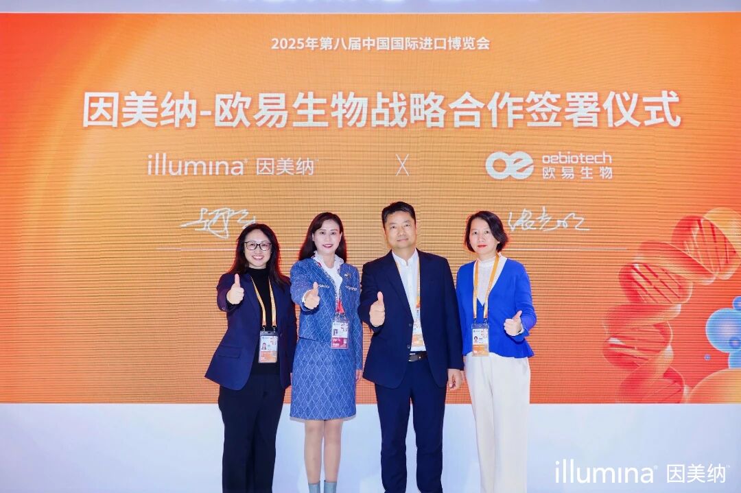 2025116日,因美纳(中国)科学器材有限公司(以下简称因美纳”)与上海欧易生物医学科技有限公司(以下简称“欧易生物”)在第八届中国国际进口博览会(以下简称“进博会”)举行因美纳-欧易生物战略合作签署仪式。