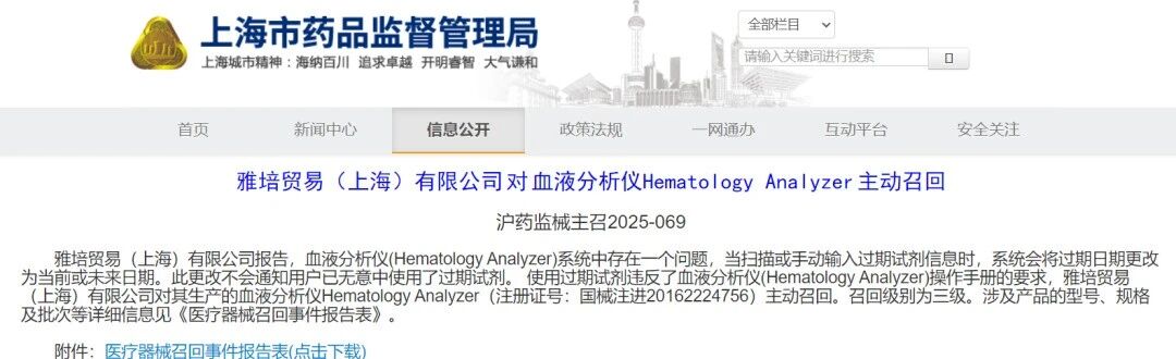今年3月份曾经发起过一次三级召回事件;原因是血液分析仪(Hematology Analyzer)系统中存在一个问题,当扫描或手动输入过期试剂信息时,系统会将过期日期更改为当前或未来日期。此更改不会通知用户已无意中使用了过期试剂。 使用过期试剂违反了血液分析仪(Hematology Analyzer)操作手册的要求,雅培贸易(上海)有限公司对其生产的血液分析仪Hematology Analyzer(注册证号:国械注进20162224756)主动召回。召回级别为三级。此次召回涉及产品在全球有231台,其中221台在中国。