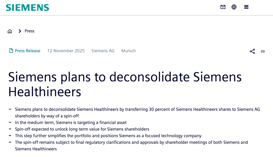 当地时间11月12日,西门子宣布,拟对其目前持有约67%股份的西门子医疗进行去并表操作。公司计划将30%的西门子医疗股份通过直接分拆的方式转让给西门子股东,使股东可直接持有西门子医疗股份。