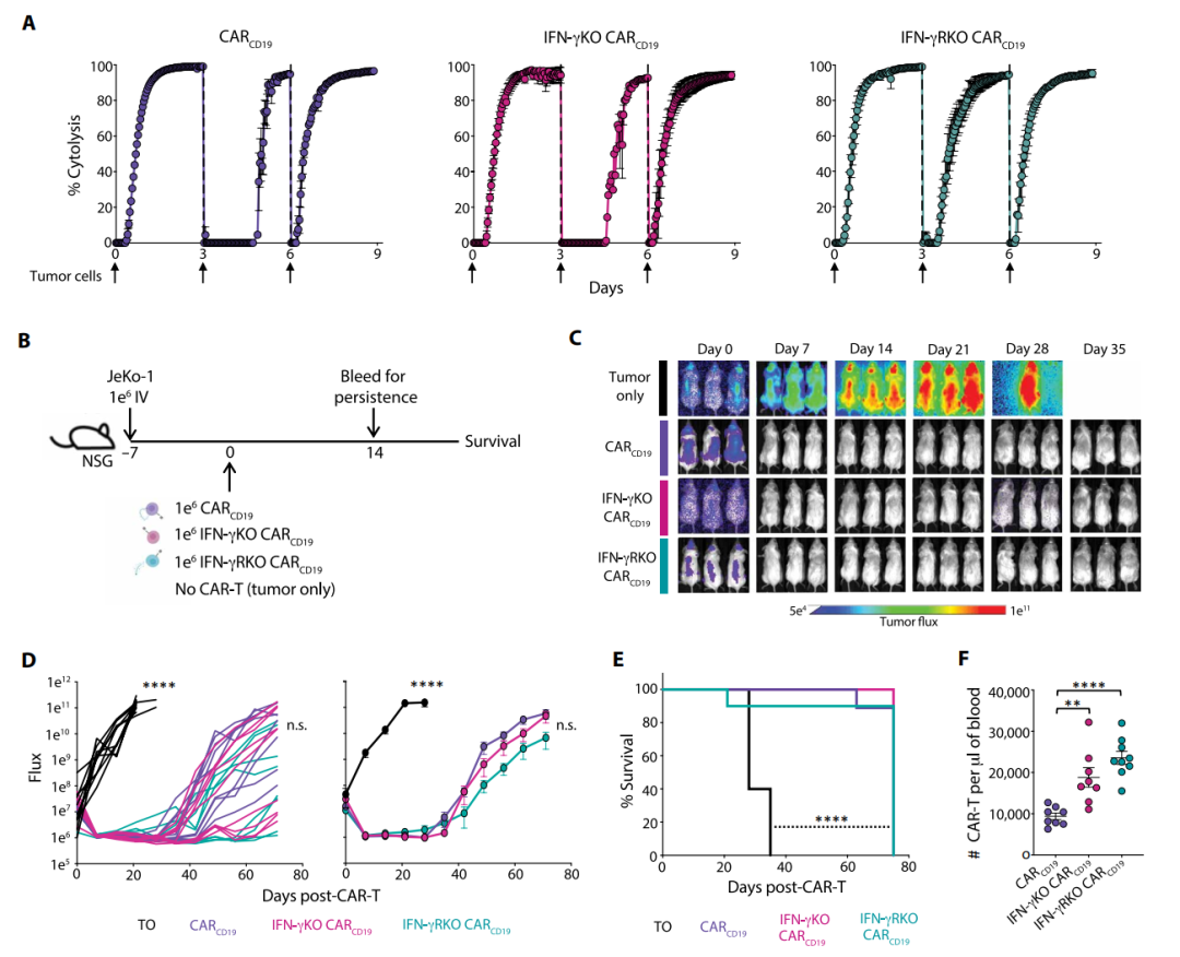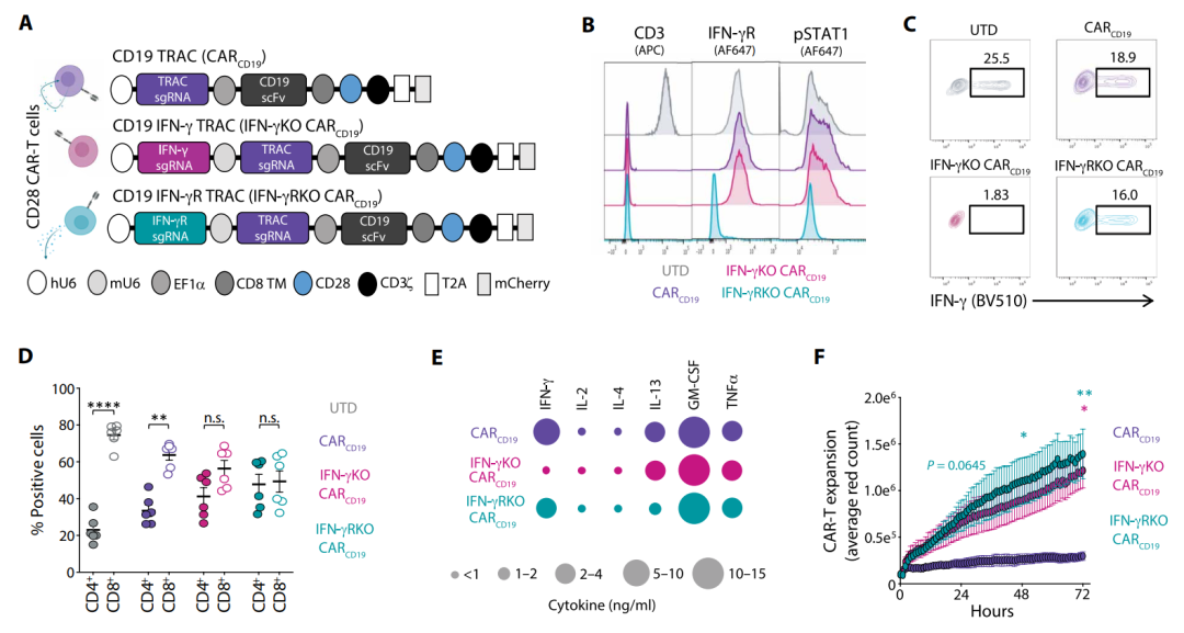 内容概览 近日,国际顶尖期刊《科学》旗下权威医学期刊《科学·转化医学》发表了一项具有里程碑意义的CAR-T细胞疗法研究。该研究由麻省总医院癌症中心细胞免疫治疗项目的Marcela V. Maus教授领衔,Stefanie R. Bailey博士与Hana N. Takei博士作为共同第一作者,联合多个顶尖团队共同完成。 研究团队通过创新性地敲除CAR-T细胞中的干扰素-γ受体,成功打造出新一代“IFN-γ抵抗型”CAR-T细胞。这种细胞在白血病、淋巴瘤、胰腺癌及三阴性乳腺癌等多种小鼠模型中,均表现出更强的扩增能力、持久性和肿瘤清除效果,甚至能建立长期免疫记忆,有效防止肿瘤复发。 研究背景 嵌合抗原受体(CAR)T细胞已彻底改变了血液恶性肿瘤患者的治疗格局,近期更有多款CAR-T疗法获批用于治疗B细胞淋巴瘤、B细胞白血病和多发性骨髓瘤。然而,该领域面临的临床挑战之一是复发问题,其发生主要源于肿瘤的抗原逃逸或CAR-T细胞植入与持久性不足。干扰素-γ(IFN-γ)是一种主要由T细胞和自然杀伤(NK)细胞释放的促炎细胞因子,在癌症中扮演复杂且有时相互矛盾的角色。最近研究证明,在血液肿瘤模型中,嵌合抗原受体(CAR)T细胞产生IFN-γ并非其发挥疗效所必需;而在实体瘤细胞中,IFN-γ受体(IFN-γR)信号传导则有助于CAR T细胞的粘附和抗原特异性细胞毒性。 主要结果 1 敲除IFN-γ或IFN-γR可促进CD28 CAR-T细胞在体外的扩增 本文作者此前曾报道,在靶向CD19、携带CD28或4-1BB共刺激域的CAR-T细胞中,基因敲除IFN-γ能在不影响血液恶性肿瘤抗肿瘤疗效的同时,限制其潜在毒性[2]。此外,我们发现IFN-γ敲除(IFN-γKO)的CAR-T细胞在体外对CD19阳性的Nalm6白血病细胞系表现出更强的扩增能力,尤其是在携带CD28共刺激域的CAR-T细胞中。为更深入研究IFN-γ信号传导对这些过程的影响,我们利用CRISPR-Cas9技术构建了靶向CD19、携带CD28共刺激域,并敲除IFN-γ或IFN-γR的CAR-T细胞。构建体使得我们能够利用一系列CAR-T细胞来研究IFN-γ信号传导的各个方面,这些细胞包括:(i)能够产生并响应IFN-γ的(CAR,对照组);(ii)IFN-γ缺陷型,能够响应但不产生IFN-γ的(IFN-γKO CAR);以及(iii)IFN-γ抵抗型,能够产生但不响应IFN-γ的(IFN-γRKO CAR)。 IFN-γKO和IFN-γRKO CARCD19 T细胞的增强扩增具有抗原依赖性,因为在缺乏抗原或白细胞介素-2的条件下,这些细胞无法存活或扩增。为探究该效应是否普遍适用于各类CAR-T细胞,还是仅限于携带CD28共刺激域的类型,我们构建了靶向CD19、携带4-1BB共刺激域的IFN-γKO和IFN-γRKO CAR-T细胞(图G和H)。与CD28 CAR-T细胞相反,我们发现对于携带4-1BB共刺激域的CAR-T细胞,敲除IFN-γ或IFN-γR并不能增强其在应对肿瘤细胞时的扩增能力(图I)。这些数据表明,IFN-γ信号通路特异性抑制CD28 CAR-T细胞(而非4-1BB CAR-T细胞)的生长。 2 IFN-γKO与IFN-γRKO CARCD19 T细胞在维持抗血液肿瘤活性的同时,于体内展现出更强的持久性 在体外经历多次Nalm6细胞反复刺激后,IFN-γ及IFN-γR敲除的CARCD19 T细胞仍能保持与对照组无异的细胞毒性潜能(图A)。研究人员给携带套细胞淋巴瘤细胞系JeKo-1的NOD SCID gamma小鼠分别输注上述各组CAR-T细胞,并持续监测其肿瘤负荷、生存情况及CAR-T细胞的扩增(图B)。结果发现,尽管存在一定的供体间差异,但IFN-γKO和IFN-γRKO CARCD19 T细胞介导的抗肿瘤效果(图C和D)与小鼠生存率(图E)与对照组CARCD19 T细胞相当。 IFN-γ信号通路敲除对CD19 CAR-T细胞的体外分化及耗竭状态影响甚微。 敲除IFN-γ或IFN-γR可保护靶向CD19的CAR-T细胞免于细胞死亡。 3 IFN-γ信号缺失可增强靶向间皮素的CD28 CAR-T细胞存活能力 与靶向CD19的CAR-T细胞类似,尽管在缺失IFN-γ或IFN-γR的CAR-T细胞中观察到CD4:CD8比率趋向更均衡的明显变化,但所有组别均表现出相似的激活状态和功能特征。活细胞成像分析和基于流式细胞术的微球计数均显示,IFN-γRKO CARMESO T细胞在接触间皮素抗原后表现出更强的扩增能力。当在体外用多种间皮素阳性的胰腺癌细胞系进行攻击时,与对照组CARMESO T细胞相比,IFN-γKO和IFN-γRKO CARMESO T细胞分别针对Capan-2或BxPC-3和Capan-2表现出更强的扩增。与靶向CD19的CAR-T细胞研究结果一致,IFN-γ信号的缺失并未导至CAR-T细胞在分化、免疫检查点蛋白表达或增殖能力方面出现差异。相反,抗原暴露后IFN-γ信号的缺失导至了CAR-T细胞凋亡性死亡的减少。这些数据共同表明,通过敲除IFN-γ,尤其是敲除IFN-γR来阻断IFN-γ信号传导,能够改善CAR-T细胞的存活,这一效果不受靶抗原特异性或表达靶抗原的细胞组织学类型的影响。 通过动物体内实验证明,虽然CAR-T细胞自身产生IFN-γ对于其抗肿瘤效力至关重要,但细胞本身响应IFN-γ的能力并非必需。 4 靶向EGFR的IFN-γRKO CAR-T细胞能够提供抵抗肿瘤再攻击的保护力 敲除IFN-γR能够产生具有长期抗肿瘤活性和生存优势的CAR-T细胞。此外,在对照CAR-T细胞失效的情况下,IFN-γRKO CAR-T细胞展现了抵御肿瘤再攻击的能力。这些数据表明,IFN-γ抵抗型CAR-T细胞在体内具有更强的扩增能力和记忆形成能力。 IFN-γRKO CAR-T细胞在三阴性乳腺癌同系模型中展现更强疗效与生存优势。 内容总结 在本研究中,作者发现IFN-γ会诱导带有CD28胞内信号域的CAR T细胞发生凋亡,而通过靶向IFN-γ或IFN-γR可以减轻这种凋亡。在血液恶性肿瘤中,敲除CAR T细胞的IFN-γR(IFN-γRKO)可在不影响疗效的情况下增强其持久性。在异种移植和同系实体瘤模型中,IFN-γR敲除的CAR T细胞表现出更强大的肿瘤控制能