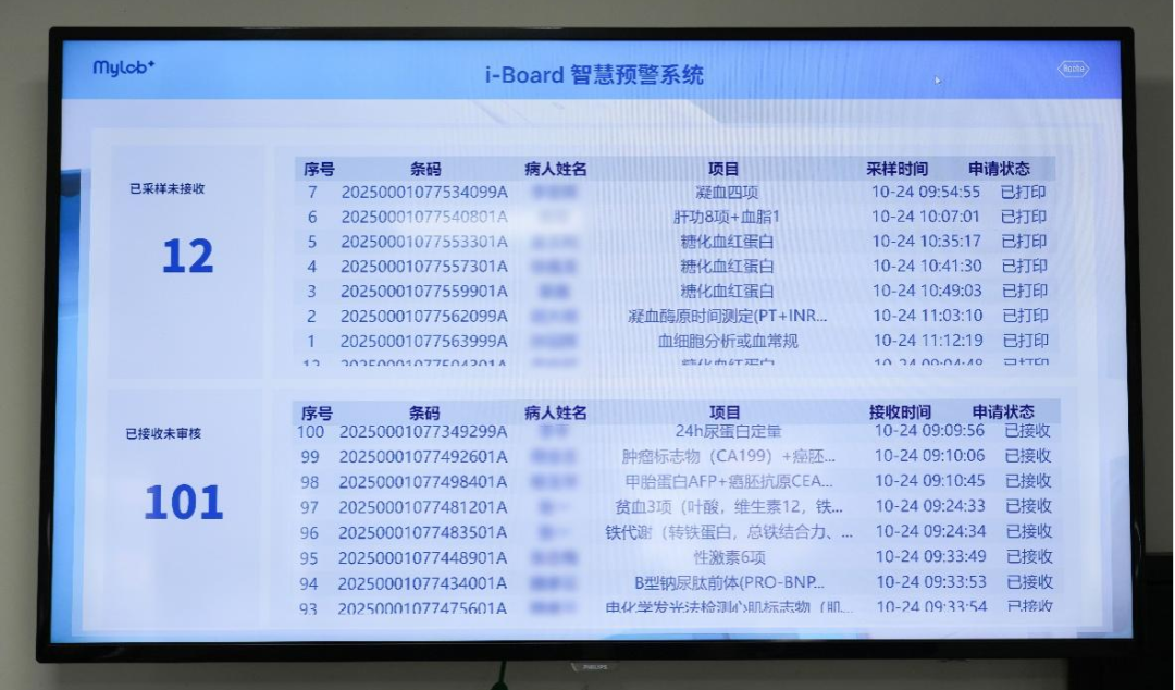 通过i-Board智慧大屏,实验室的样本流转状态、仪器运行情况、TAT时间、危急值、试剂消耗通过实时、可视化的方式呈现。马春燕主任表示:“有了智慧大屏,整个实验室工作流程变得清晰明了,科室人员能够及时察觉问题并迅速作出调整,极大地提高了工作效率与协同性。”