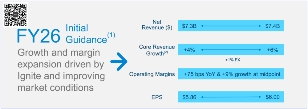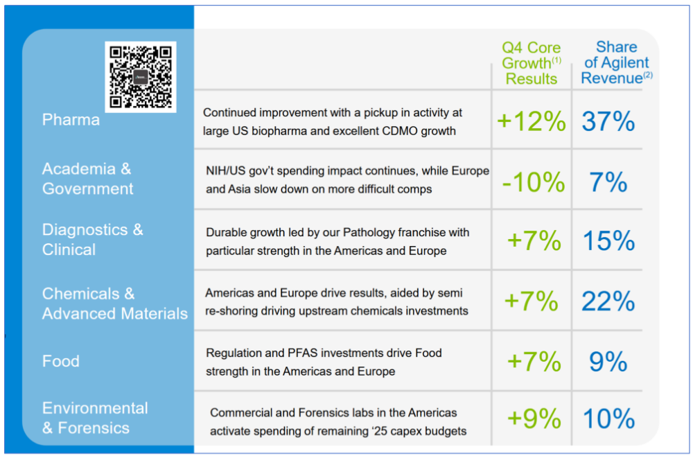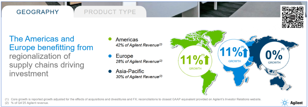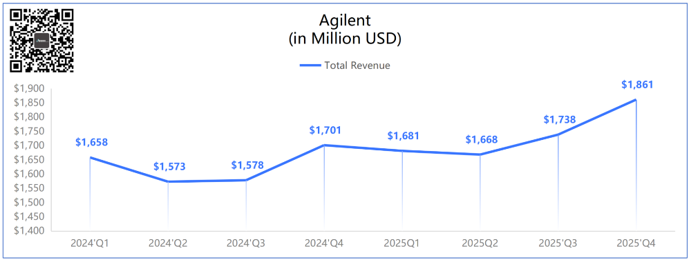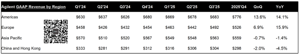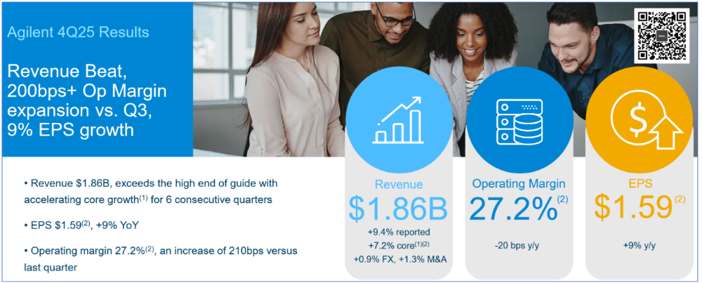 安捷伦也给出了2026财年的展望,预计去啊年营收73亿~74亿美元,核心营收增长4%~6%,EPS 5.86~6.00美元。