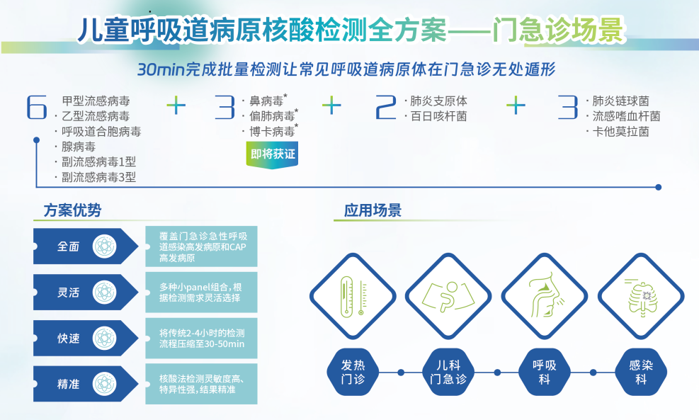 检测数量:4项 注册人:北京京东方知微生物科技有限公司 技术原理:荧光PCR法 检测靶标:呼吸道合胞病毒、副流感病毒、腺病毒、肺炎支原体的核酸 样本类型:咽拭子 检测时间:<30min 注册证号:国械注准20243402636 注册时间:2024 试剂有效期:2℃~28℃避光干燥保存,有效期12个月。