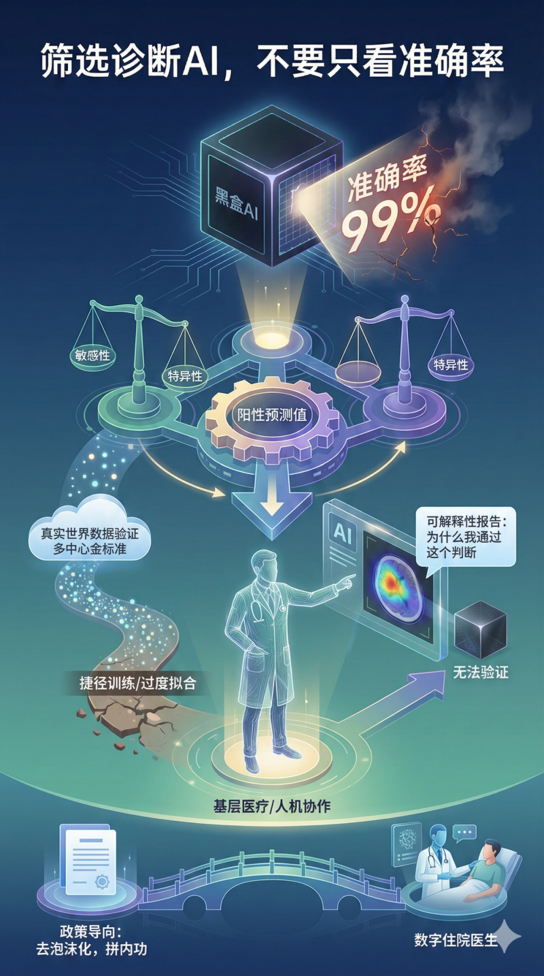 最近卫健委联合多部门发布了对8月"AI+医疗卫生"的政策解读,明确了中国医疗 AI 从炫技转向实战的实施意见,我认为这标志着医疗 AI 进入了去泡沫化、拼内功的阶段。 来源:NHC网站截图 文件核心逻辑不再是试图复制北上顶级专家,而是通过“人人可享的高水平居民健康助手”去解决基层医疗资源匮乏的痛点。作为AI诊断的从业者,我想剥离宏大的叙事,结合政策导向和技术评估标准,聊聊医疗 AI 的底层逻辑变化和识别靠谱的AI诊断产品,市面上声称“准确率高达 99%”的模型,可能不仅不够好,甚至是危险。一句话:医生无法验证的AI,不能用于诊断。 在医疗场景中,单纯谈论“准确率(Accuracy)” 存在严重的误导性。如果一种罕见病发病率只有 1%,模型只要把所有人都猜成“健康”,也能拿到 99% 的准确率,但它在临床上毫无价值,甚至因为漏诊而耽误治疗。因此,评估一个 AI 是否靠谱,必须拆解为“敏感性、特异性与阳性预测值”的博弈。对于癌症筛查或急诊分诊,我们需要极高的“敏感性”,也就是“宁可错杀,不可放过”;但在确诊环节,如果没有足够的“特异性”,医生会被海量的假阳性警报淹没,产生严重的警报疲劳,最终 沦为增加医生负担的干扰项。更重要的还有“阳性预测值”这个指标,它告诉医生:当 AI 报警时,患者真的生病的概率有多大,这才是医生在做决策时最关心的实战指标。 表1:指标汇总整理表(作者制图) 除了指标的博弈,我们还得警惕 AI 的作弊行为。很多在实验室表现完美的模型, 泛化能力严重不足,往往是因为它们在训练时走了捷径,学会了识别图中的急诊标签而非病灶,或者是过度拟合了某一种品牌 CT 机的成像风格。这也是为什么政策中特别强调建设“中试基地”和“临床专病数据集”的原因——只有经过多中心、多设备、且金标准(如病理结果)确凿的真实世界数据验证,AI 才能从科研玩具变成医疗器械。对于从业者来说,现在的当务之急是抛弃那些老旧的公开数据集,利用国家建立的新基建进行压力测试。 基于当下的技术成熟度与政策环境,在实际应用中我们必须学会做权衡。目前的“黄金策略”是:对于病历生成、医保风控等管理类任务,以及肺结节、骨折检测等成熟的影像筛查,可以大胆引入,因为它们能立竿见影地释放医生精力;但对于复杂的临床诊疗决策,必须保持审慎。在这一领域,我认为可解释性远比单纯的精度更重要。 医生绝不会信任一个只吐出结果的“黑盒”,宁愿牺牲一点点预测精度,也要换取 AI 能够生成热力图或归因报告,告诉医生“为什么我通过这个判断”,这才是人机协作的基础。2025 年的医疗 AI,不再是全知全能的神,而是一个勤恳、需要监管、且必须会“说人话”的数字住院医生。 当前全球医疗AI市场呈现出显著的技术分层与地缘差异,基于计算机视觉(CV)的“预测性AI”在放射学、病理学和眼科领域的深耕,其核心在于通过FDA、NMPA及CE等监管机构的严格审批,确立了作为医疗器械的法定地位;另一方面是基于大语言模型的“生成式AI”的爆发性增长,在临床诊断中的直接应用面临监管更严峻的审慎。 表2:AI诊断产品对比(作者制图,截至日前不完全统计) 参考内容: