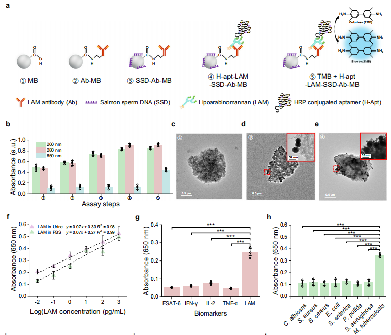 在优化了最佳检测条件后,作者使用真实尿液样本时遇到了在LAM分析中高非特异性信号的问题。通过优化磁珠浓度(1 mg/mL)、阻断剂(鲑鱼精DNA)及ConA抑制剂,作者成功消除尿液中糖类物质的非特异性干扰。结果显示,在0.01-1000 pg/mL浓度范围内,LAM检测呈线性响应(图f)。该系统在临床尿样中实现0.01 pg/mL的检测限,如此低的LOD值意味着微量LAM也可以在HIV阴性/结核阳性患者的尿液中检测到。