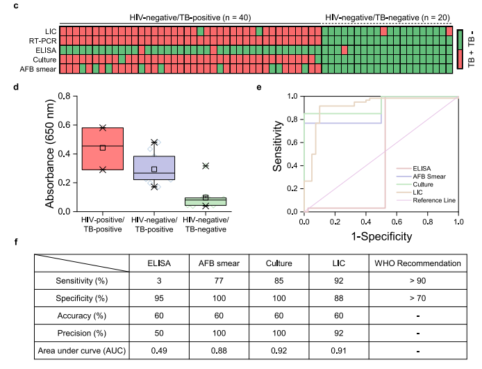 总的来说,LIC系统表现出92%灵敏度(55/60)与88%特异性(35/40),显著优于ELISA。其曲线下面积达0.91,满足WHO对结核病诊断工具的要求(灵敏度> 90%,特异性> 70%)(图f)。