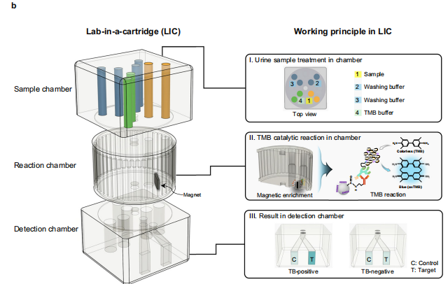 LIC利用磁性富集尿液中的LAM,辣根过氧化物酶(HRP)来放大信号强度,以及基于四甲基联苯胺(TMB)的比色法进行直接视觉分析,而无需额外的信号处理设备。LIC还可自动处理液体,无需复杂的实验室操作。LIC在自动化检测的驱动下达到的高灵敏度和高重复性,在农村和服务不足地区可以为结核病的分散监测作出重大贡献。