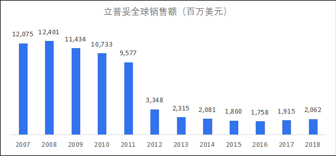 立普妥(Lipitor,化学名阿托伐他汀),全球最大制药公司美国辉瑞(Pfizer)旗下头号药物,作用于降血脂 但随着2011专利到期,立普妥逐步遭遇专利悬崖2016年销售触底只有17.58亿美元,只有顶峰时期销售额的14%