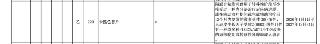 - 卡匹色替(阿斯利康):限联合氟维司群用于转移性阶段至少接受过一种内分泌治疗后疾病进展,或在辅助治疗期间或完成辅助治疗后12个月内复发的激素受体(HR)阳性、人表皮生长因子受体2(HER2)阴性且伴有一种或多种PIK3CA/AKT1/PTEN改变的局部晚期或转移性乳腺癌成人患者。