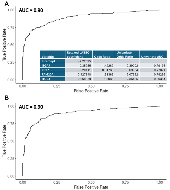 急性呼吸道感染是全球范围内发病率和死亡率居高不下的主要疾病之一,同时也是抗生素滥用的重要诱因。尽管多数急性呼吸道感染实际由病毒引起,但由于在临床实践中难以快速明确病原体类型,导至大量不必要的抗生素使用。这一问题加剧了抗生素耐药性的问题,被世界卫生组织列为全球公共卫生的最紧迫威胁之一。现有诊断手段如PCR虽能快速检测呼吸道病毒,但对细菌共感染的鉴别能力有限。因此,开发可以区分病毒性感染和需要抗生素治疗的细菌性感染以及混合感染的检测工具,可以成为解决这一临床困境的关键方向。 近日,美国罗切斯特大学在杂志Nature communications上发表了一篇题为“A four-gene signature from blood to exclude bacterial etiology of lower respiratory tract infection in adults”的文章。作者筛选出一个包含4个基因ITGB4、ITGA7、IFI27 和 FAM20A的标志物组合,能够准确区分因急性呼吸道感染而住院的成人患者中的细菌性病症与非细菌性病症。该模型在训练集中的交叉验证曲线下面积达到0.90,显示出卓越的细菌与非细菌感染的区分能力。这种方法提供了一种辅助临床判断的工具,有助于减少不必要的抗生素使用。 图片来源:Nature communications 本研究纳入了504例经微生物学确认的急性呼吸道感染患者(包括280例病毒感染、129例细菌感染及95例混合感染),以及63例非感染性疾病患者作为对照组。通过差异基因表达分析,研究团队比较了单纯病毒感染组与任何细菌感染组(包括单纯细菌感染和混合感染)的转录组数据,识别出显著差异表达的基因,并最终筛选出一个包含4个基因的标志物组合:ITGB4、ITGA7、IFI27 和 FAM20A。该模型在训练集中的交叉验证曲线下面积达到0.90 (下图 A),显示出优异的细菌与非细菌感染的区分能力。