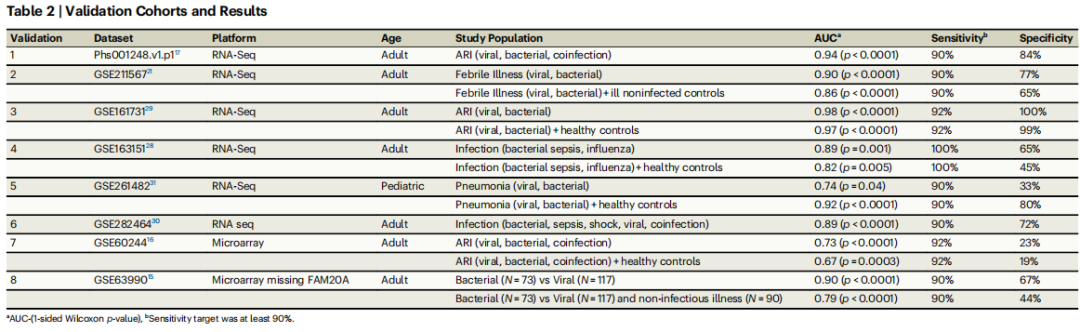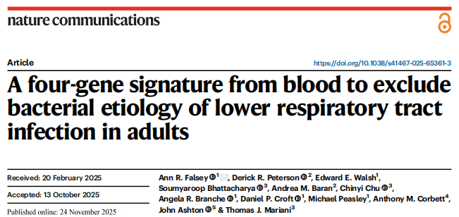 确定分类阈值以提高临床适用性。图片来源:Nature communications 本研究开发并验证了一个基于血液的四基因标志物(ITGB4、ITGA7、IFI27、FAM20A),能够以高精度区分细菌性与非细菌性呼吸道感染。该标志物在多个独立队列中表现出稳定的诊断性能,尤其在高阴性预测值方面表现突出,有望成为辅助临床决策、减少抗生素滥用的有效工具。