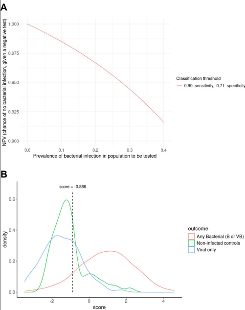 4 个基因诊断特征的多队列外部验证。图片来源:Nature communications 四基因特征代表了患者的细菌感染风险评分或感染细菌的概率值。风险评分越高,患者感染细菌的可能性就越大。作者设定风险评分阈值为-0.886,如果患者风险评分超过-0.886,则患者细菌感染概率> 29%,可被分类为细菌感染。模型在训练集中实现90%的敏感性与71%的特异性。当细菌感染患病率为40%时,阴性预测值达91%,若患病率降至25%以下,阴性预测值可超过95%(下图 A)。这一阈值设计旨在最大程度排除细菌感染,为临床决策提供停止抗生素使用的可靠依据。