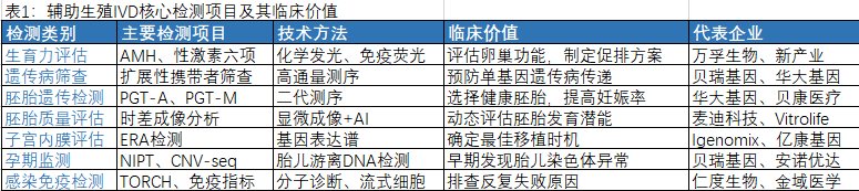 辅助生殖是一个高度依赖精准诊断的医学领域,IVD技术几乎渗透到每一个关键环节,其应用场景可分为孕前筛查与生育力评估、遗传病携带者筛查、胚胎植入前遗传学检测、胚胎培养与实时监测、子宫内膜容受性检测、孕期无创产前检测、感染与免疫因素检测。涉列的企业有我们熟悉的贝康医疗、华大基因、贝瑞基因、新产业、万孚等IVD企业,显示当前辅助生殖产业链中复杂的竞争格局,这条产业链还是比较长的。
