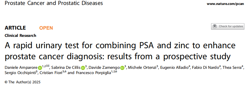 近日,意大利都灵大学在杂志Prostate Cancer and Prostatic Diseases上发表了一篇题为“A rapid urinary test for combining PSA and zinc to enhance prostate cancer diagnosis: results from a prospective study”的文章。本研究旨在开发一种结合尿前列腺特异性抗原(uPSA)与尿锌(uZinc)的快速、非侵入性尿液检测方法,评估其单独及联合现行标准诊疗(SOC)参数,包括年龄、血清PSA、直肠指检及多参数磁共振成像,在前列腺癌诊断中的价值,并探索其在减少不必要活检方面的潜力。整合尿液检测的决策算法表明,51% 的男性可以安全地避免活检。这种尿液 uPSA/uZinc检测是一个很有前景的补充手段,将其与多参数磁共振成像(mpMRI)和标准临床参数相结合,能够优化风险评估,并实现患者的个性化管理。