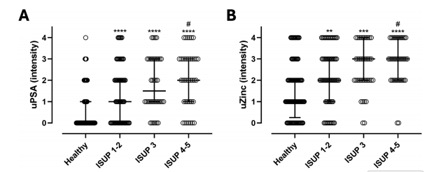 健康人与前列腺癌患者的uPSA和uZinc浓度。图片来源:Prostate Cancer and Prostatic Diseases