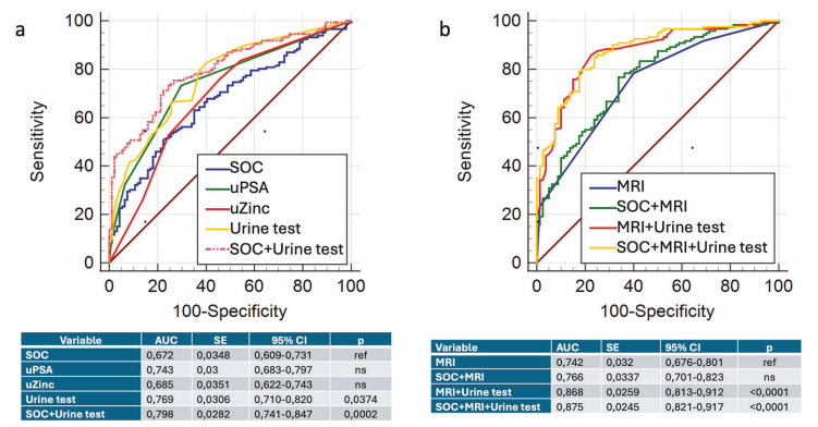 作者构建了逻辑回归模型来评估快速尿液检测在鉴别前列腺癌方面的诊断性能,包括一个基于 sPSA、年龄和 DRE 的 SOC 模型、分别基于 uPSA 和 uZinc 的模型、联合uPSA 和 uZinc的尿液检测以及一个整合了 SOC 和尿液生物标志物的完整模型(SOC + 尿液检测)。分析表明,所有变量均与癌症风险呈正相关。DRE的odds ratio (OR)为 1.63,血清PSA为 1.03,年龄为 1.04。uPSA的OR为 2.19,uZinc为 1.41。ROC 曲线分析显示,基于尿液生物标志物的模型 AUC 为0.769 ,SOC + 尿液检测将 AUC 提高到了 0.789(下图 a)。在接受磁共振成像(mpMRI)检查的患者亚组中,尿液检测+mpMRI组合的AUC为0.868,而SOC+mpMRI+尿液检测模型进一步增至0.875(下图b)。