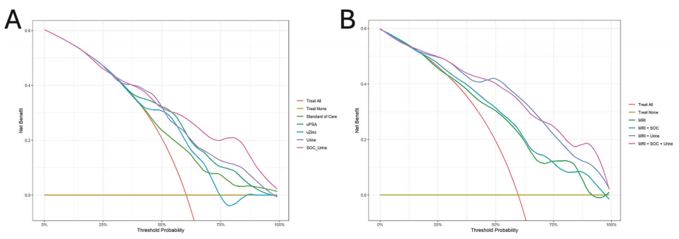 为了评估这些预测模型的临床应用价值,作者针对不同的阈值概率进行了决策曲线分析(DCA)。分析显示,SOC+尿液检测模型在广泛的阈值概率范围内具有最高净收益(下图 A)。针对接受了mpMRI检查的患者,综合模型(MRI 加上 SOC 加上尿液检测)表现最佳,在所有阈值下始终显示出最高的净效益,这凸显了结合影像学、临床和分子数据的价值(图 B)。在符合算法条件的患者中,51%的阴性尿液检测结果者可避免活检,仅遗漏14%的低级别前列腺癌(ISUP<2),且未遗漏高级别肿瘤。