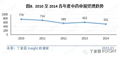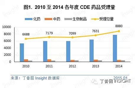 根据丁香园 Insight 数据库统计,2014 年国家食药监管总局药审中心(CDE)共承办药品注册新申请以受理号计达 8880 个,创历史新高。其中化药受理量为 7807,亦是历史之最;而中药受理量与往年相比有所减少,为连续 5 年来最少;生物制品受理量相对稳定。