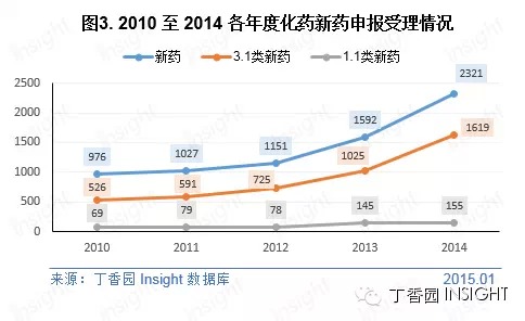 从上图可以看出,进口和补充申请量同往年相比浮动不大;仿制药申请量在逐年递增,但2014年同2013年相比增幅不大;而新药、进口再注册申请量均有大幅增加,进口再注册 2014 的申请量与2013年相比甚至翻了一倍多。去年发生的百多邦药荒事件,也让药企开始重视药品再注册的事情。 (1)新药申报量大幅攀升 根据丁香园 Insight 数据库统计,2014 年 CDE 共承办新的化药新药申请已受理号计达 2321 个,创下连续5年来的最高点。较去年同期相比,增幅高达 46%。