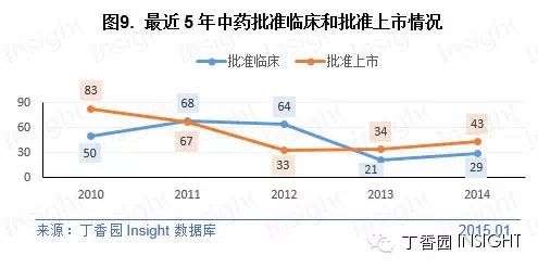 根据丁香园 Insight 数据库统计,2014 年 CDE 共承办新的中药注册申请以受理号计为 531 个,为近 5 年来的最低点。从数据可以看出,近年来中药的申报量是在逐年减少。 其中1类新药有 3 个品种,中国中医科学院中药研究所的五羟黄酮、尿酸疏安胶囊申报临床,贵州景峰注射剂有限公司的黄芪甲苷、黄芪甲苷葡萄糖注射液申报上市。而中国中医科学院中药研究所的五羟黄酮、尿酸疏安胶囊已有结论,不批准。 审批情况:与 2013 年相比数量略有回升 2014 年中药批准临床和批准上市数量与 2013 年相比均略有增加,详细数据如下所示: