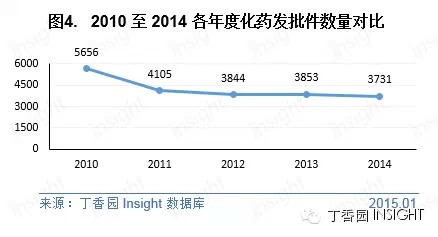 3. 审批情况 化药已发批件数量近 5 年逐年降低 根据丁香园 Insight 数据库统计,针对化药的注册申请,2014 年 CFDA 审批完毕已发批件 3731 件,同 2013 年相比有小幅减少。但从总体来看,发批件的数量近 5 年来在持续走低。