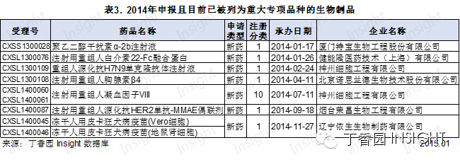 另外,在 2014 年申报的生物制品当中,目前已有 7 个品种被列为重大专项品种。其中,厦门特宝生物的聚乙二醇干扰素 α-2b 注射液为上市申请,其它品种均为临床申请。神州细胞工程有限公司的注射用重组人凝血因子 VIII 为 10 类,其它品种均为 1 类新药。具体数据如下所示: