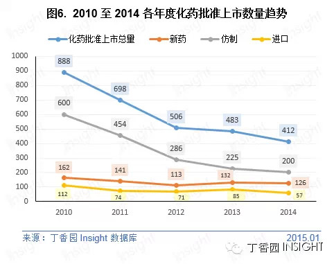 根据 Insight 数据库统计,2014 年 CFDA 共批准化药上市申请 421 个(以受理号计,未计入批准进口再注册和批准补充的数量),与 2013 年(483个)相比,有所减少,减幅达 15%。总体来看,近 5 年来化药批准上市数量是在逐年递减,且主要集中在仿制药上。近年来食药监局对国内仿制药的审评要求和质量把控在加强。